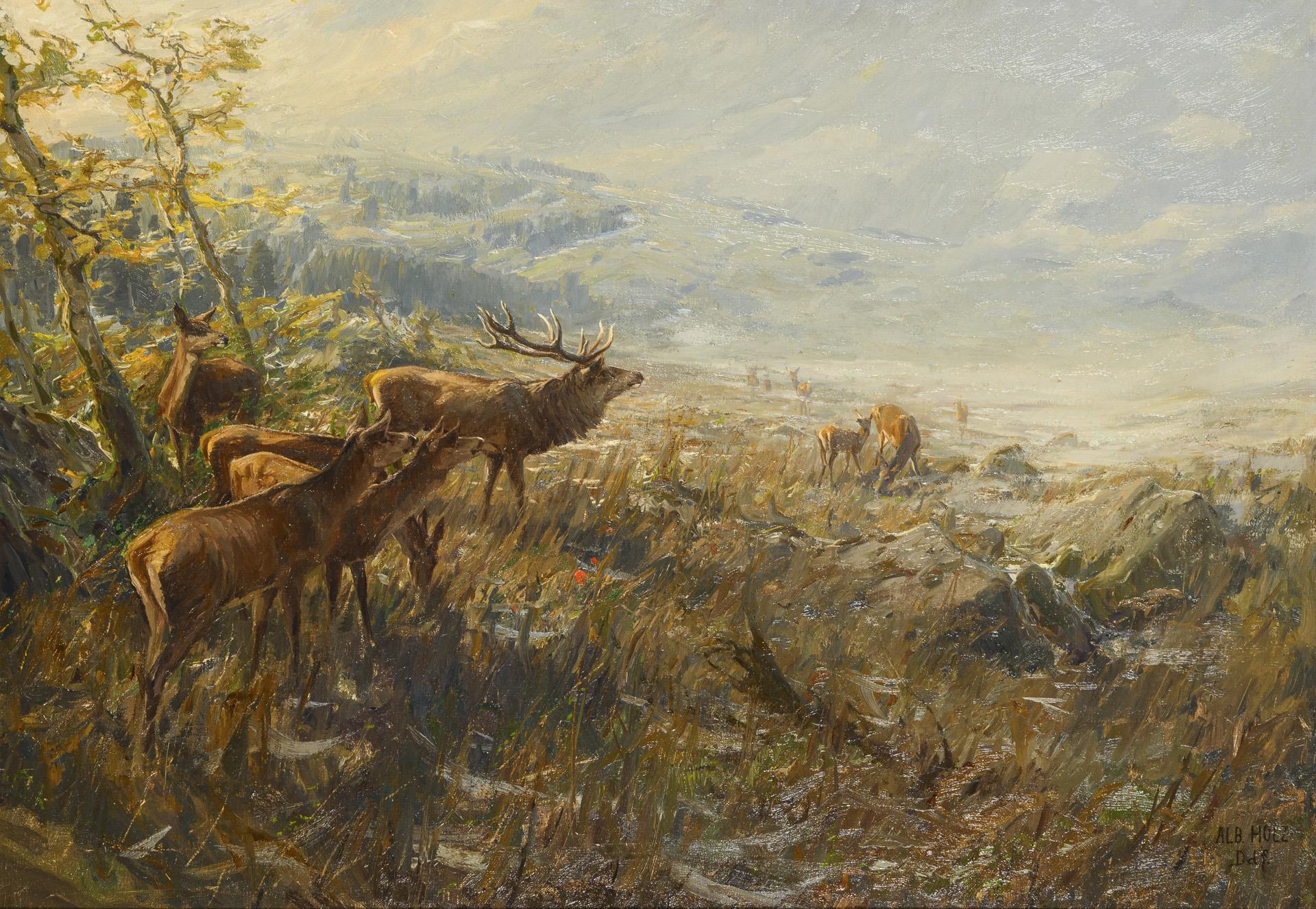 Das Hirschrudel an einem sonnigen Morgen am Waldrand mit Blick hinab ins neblige Tal. Minimale Altersspuren.