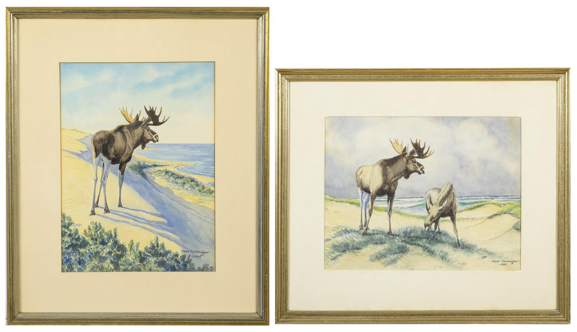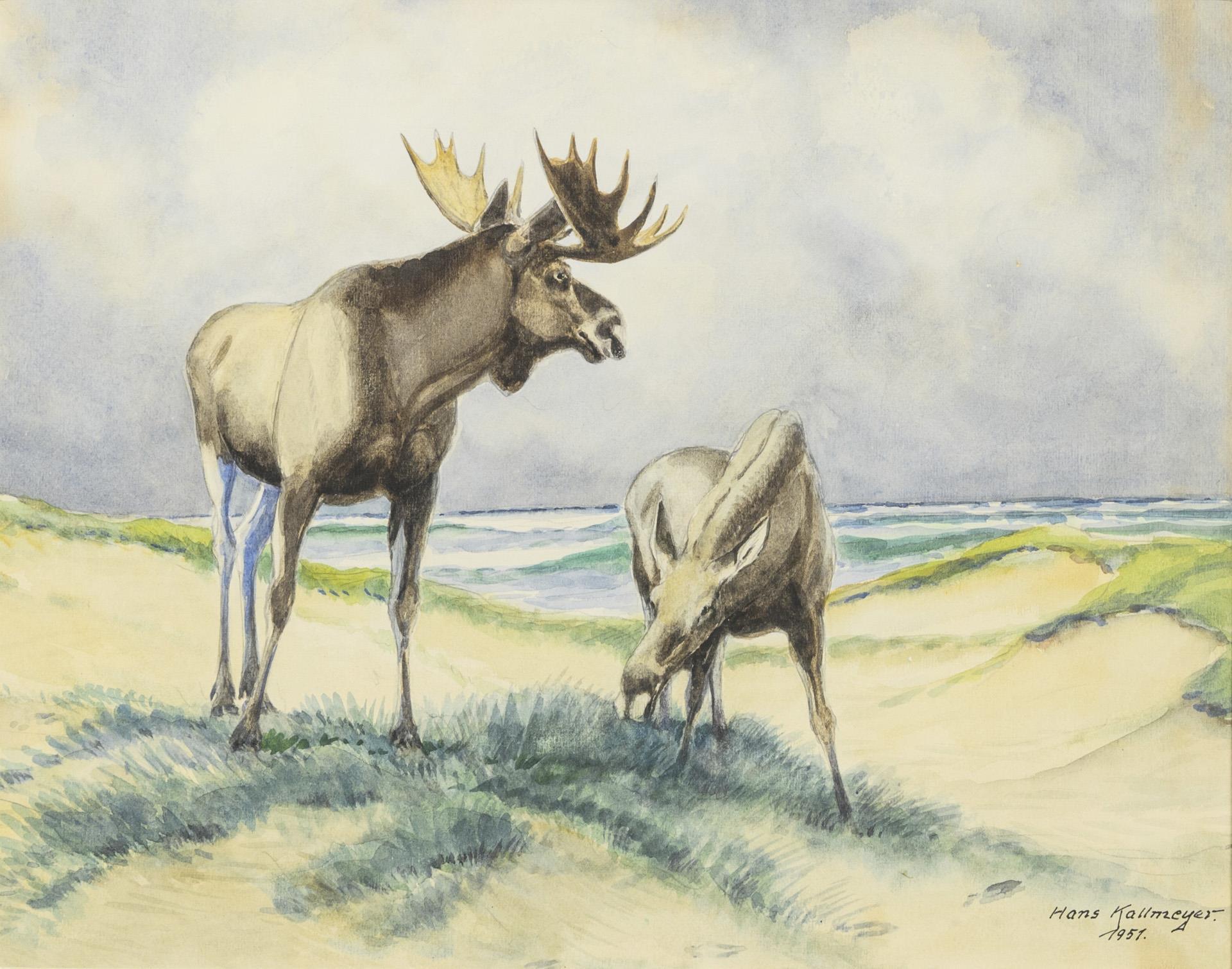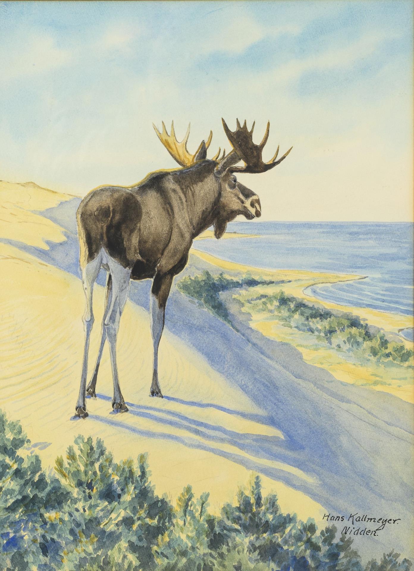 Elch im Sonnenschein auf einer Düne mit Blick hinunter zum Strand sowie zwei Elche in den Dünen unter wolkigem Himmel.
