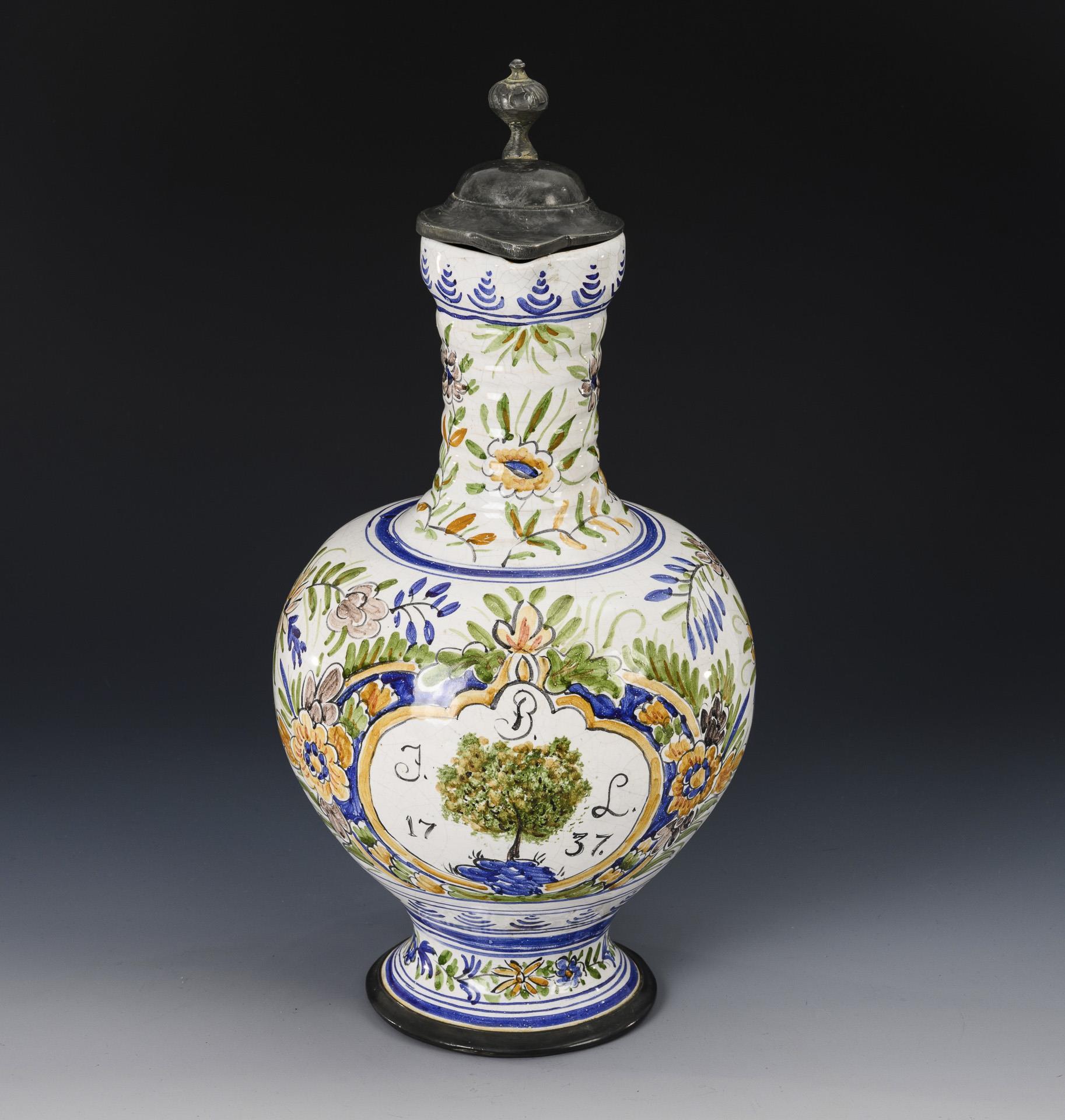 Kugelbauchkrug mit gerilltem Enghals, geflochtenem Henkel und abgesetztem Rundstand. Schauseitig eine geschweifte Reserve mit Baummotiv, bezeichnet "J.B.L. 1737", umlaufend Blumendekor. Zinndeckel mit Kugeldrücker, Zinnstandring. Leichte Alters- und Gebrauchsspuren.