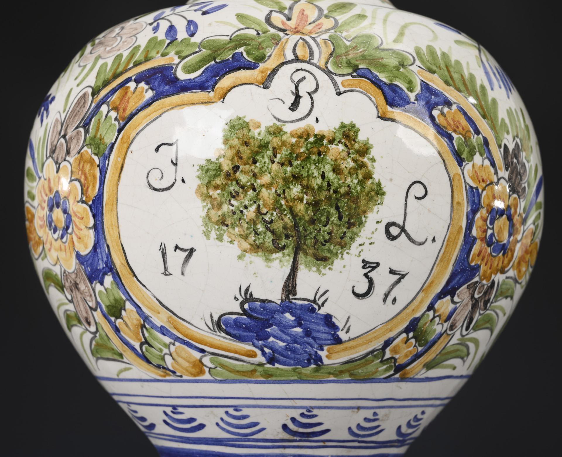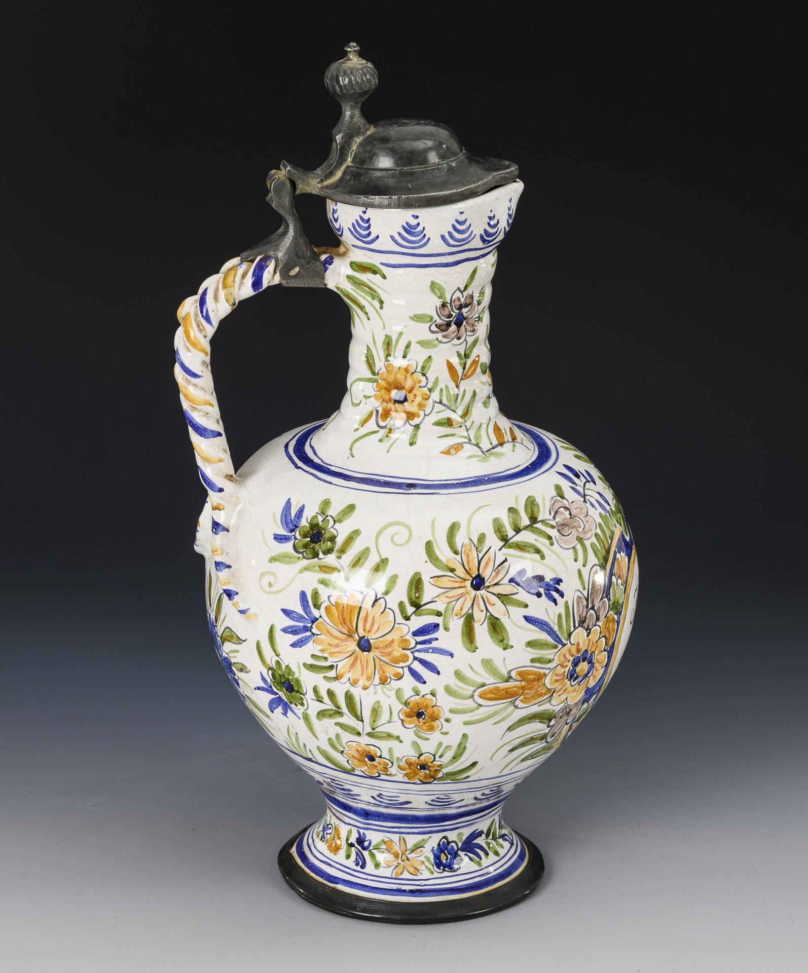 Kugelbauchkrug mit gerilltem Enghals, geflochtenem Henkel und abgesetztem Rundstand. Schauseitig eine geschweifte Reserve mit Baummotiv, bezeichnet "J.B.L. 1737", umlaufend Blumendekor. Zinndeckel mit Kugeldrücker, Zinnstandring. Leichte Alters- und Gebrauchsspuren.