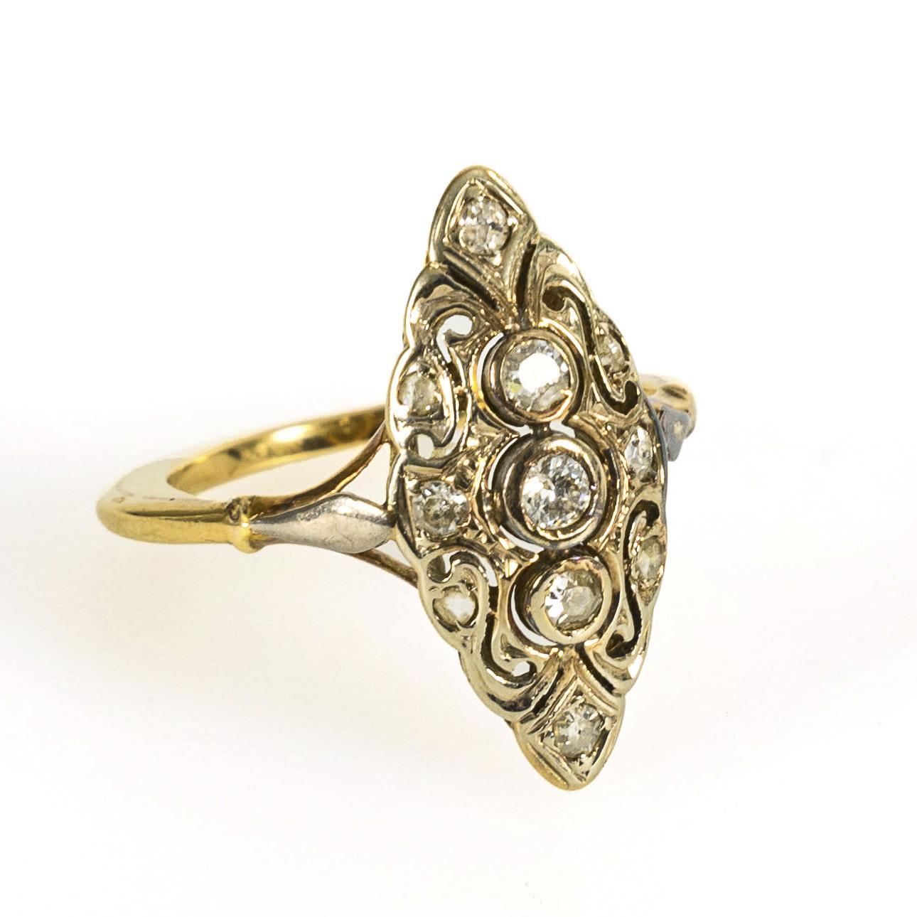 2-farbiger Art déco-Ring, der schiffchenförmige, durchbrochen gearbeitete Ringkopf mit 3 Altschliffbrillanten sowie 8 kleineren Diamanten besetzt.