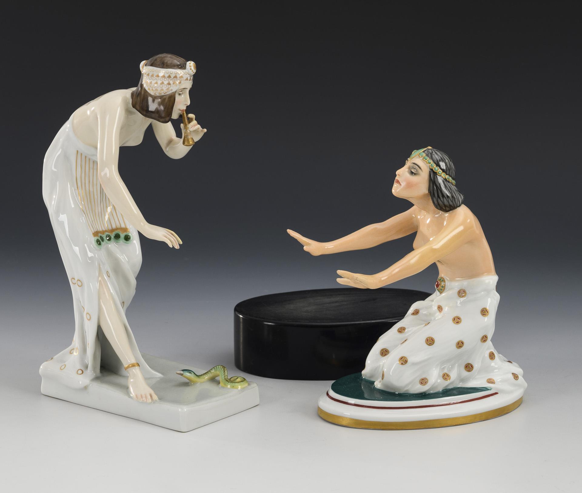 1x Modell-Nr. K 442: Auf einer Rechteckplinthe vor einer "tanzenden" Schlange eine Flöte spielende junge Frau (H 19 cm). / 1x Modell-Nr. K 437: Auf einer Ovalplinthe kniender Halbakt einer jungen, die Arme ausstreckenden Frau. Mit Holzsockel (H 14 cm, H gesamt 18 cm). 3 Finger und Schalmei der Schlangentänzerin restauriert, beide Arme und Oberkörper der Indischen Tänzerin restauriert.