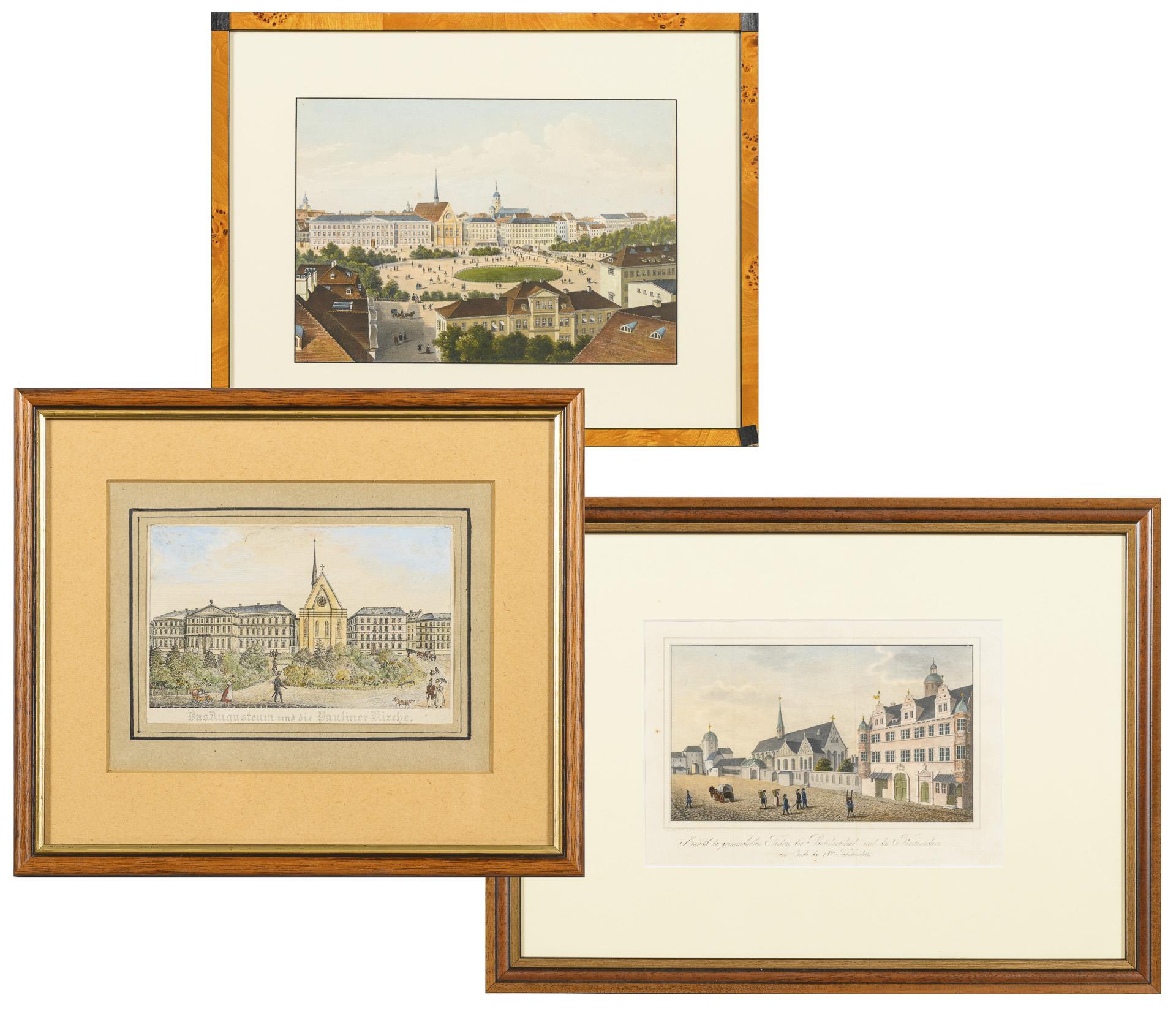 "Ansicht des Grimmaischen Thores, der Paulinerkirche und des Fürstenhauses am Ende des 18. Jahrhunderts". Leichte Bugfalte, (Bild 14 x 24 cm) / "Das Augusteum und die Pauliner Kirche" (Bild 8 x 12,5 cm) / Blick auf Augusteum, Paulinerkirche und den Platz davor, unbezeichnet, (Bild 21 x 30,5 cm).