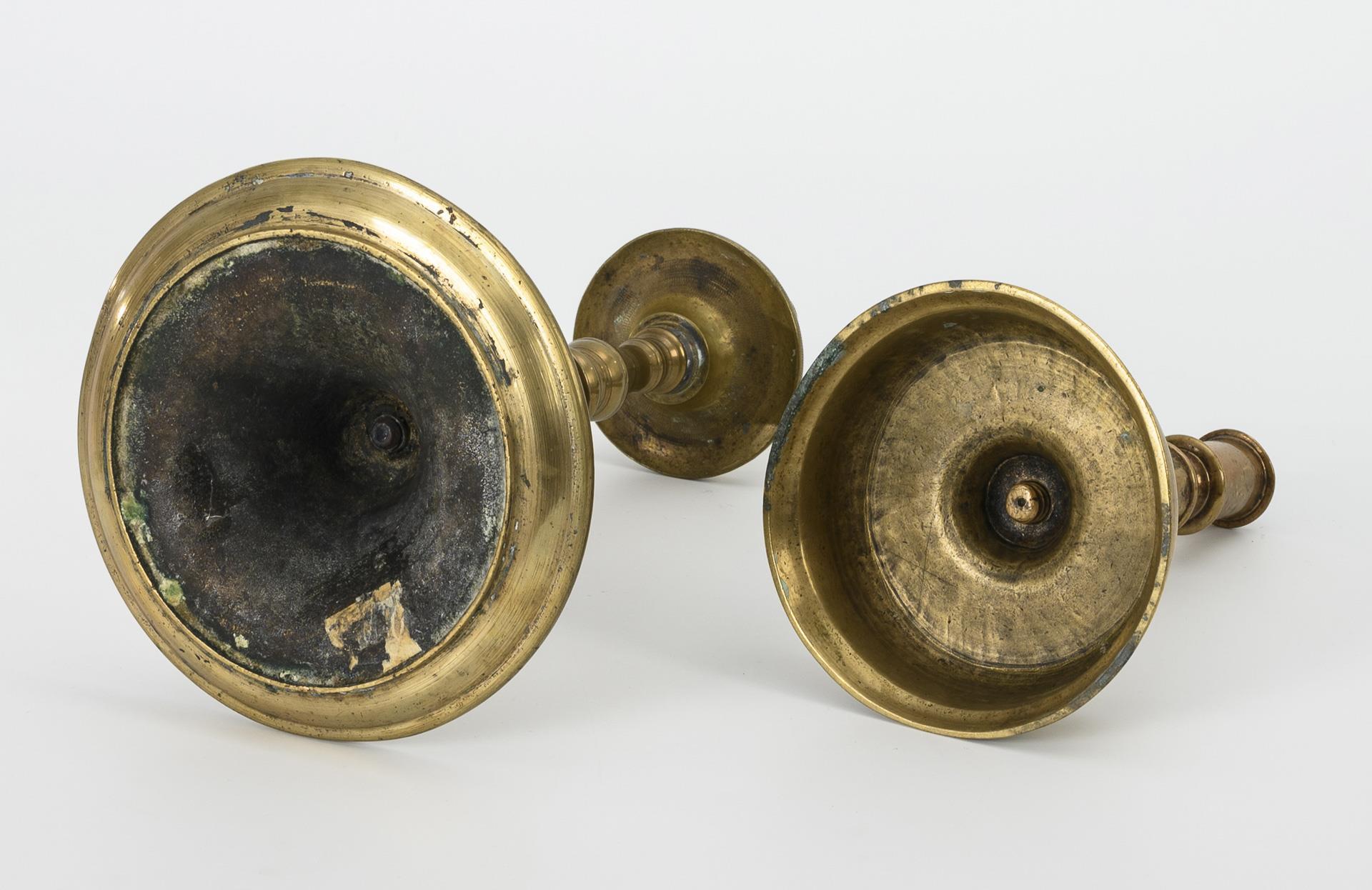 Großer Leuchter mit Schalenfuß, Balusterschaft sowie Tropfschale und Walzentülle mit gerauhten Bändern. / Glockenleuchter mit facettiertem Schaft und Walzentülle. Großer Leuchter mit Lötreparaturen, je geringe Haarrisse und Alters-/Gebrauchsspuren.