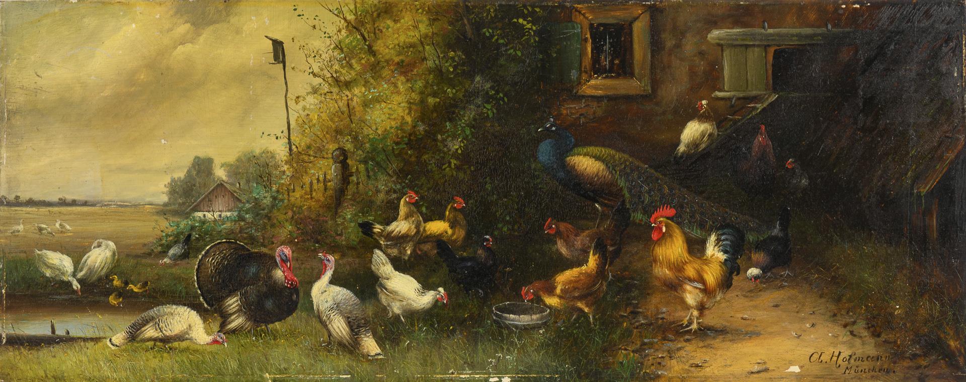 Truthähne, Hühner und ein Pfau nahe de Bach am Stall. Minimale Altersspuren.