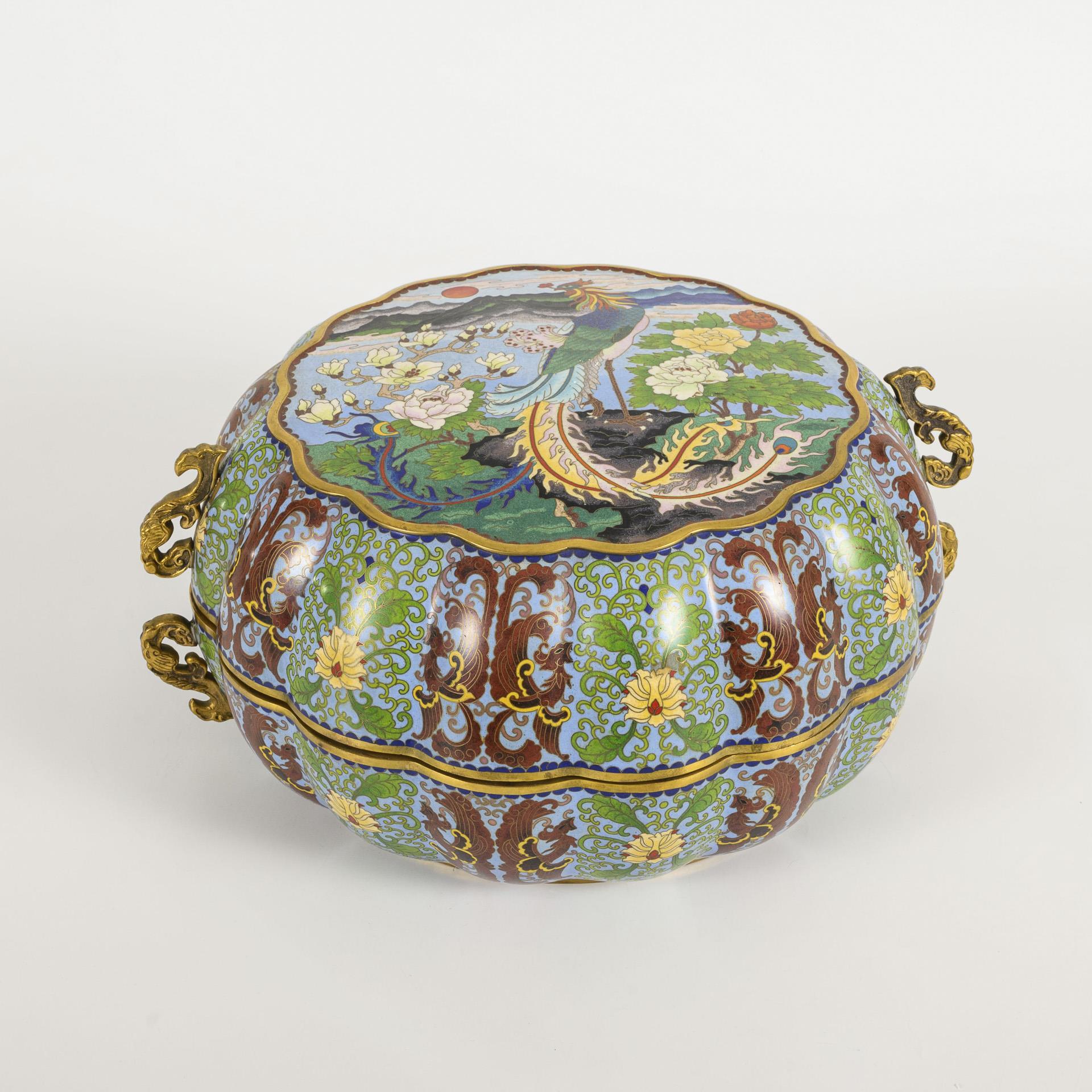 Mehrpassige Wandung, Deckel mit Phönix in blühender Landschaft. Seitlich florale Musterung. Reliefierte Handhaben.
