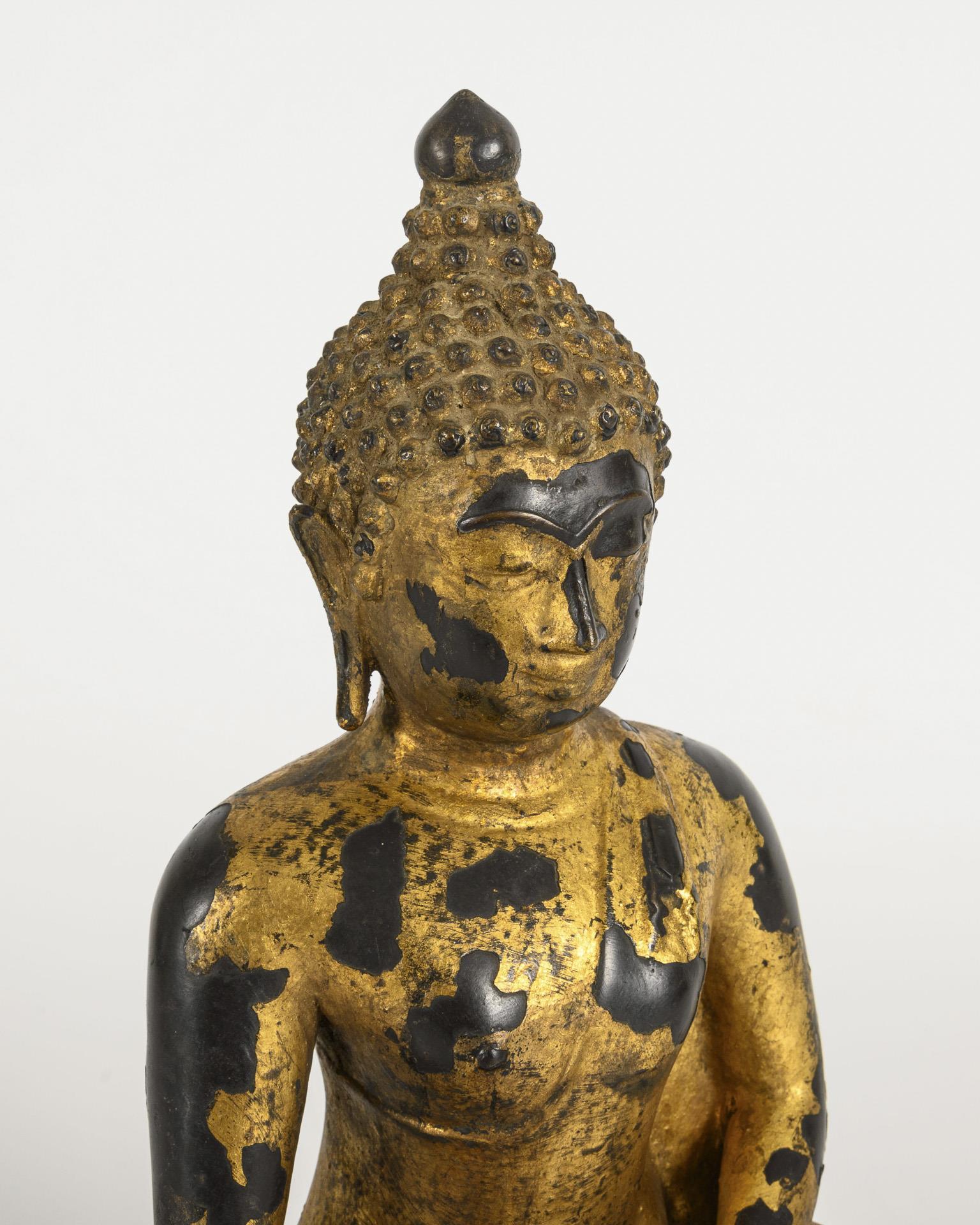 Auf stilisiertem Sockel sitzende Figur mit der Geste der Erdberührung. Auf die Grundformen reduzierte Figur, mit Goldfarbe bemalt. Innen gefüllt. Farbfassung in Teilen mit Fehlstellen.