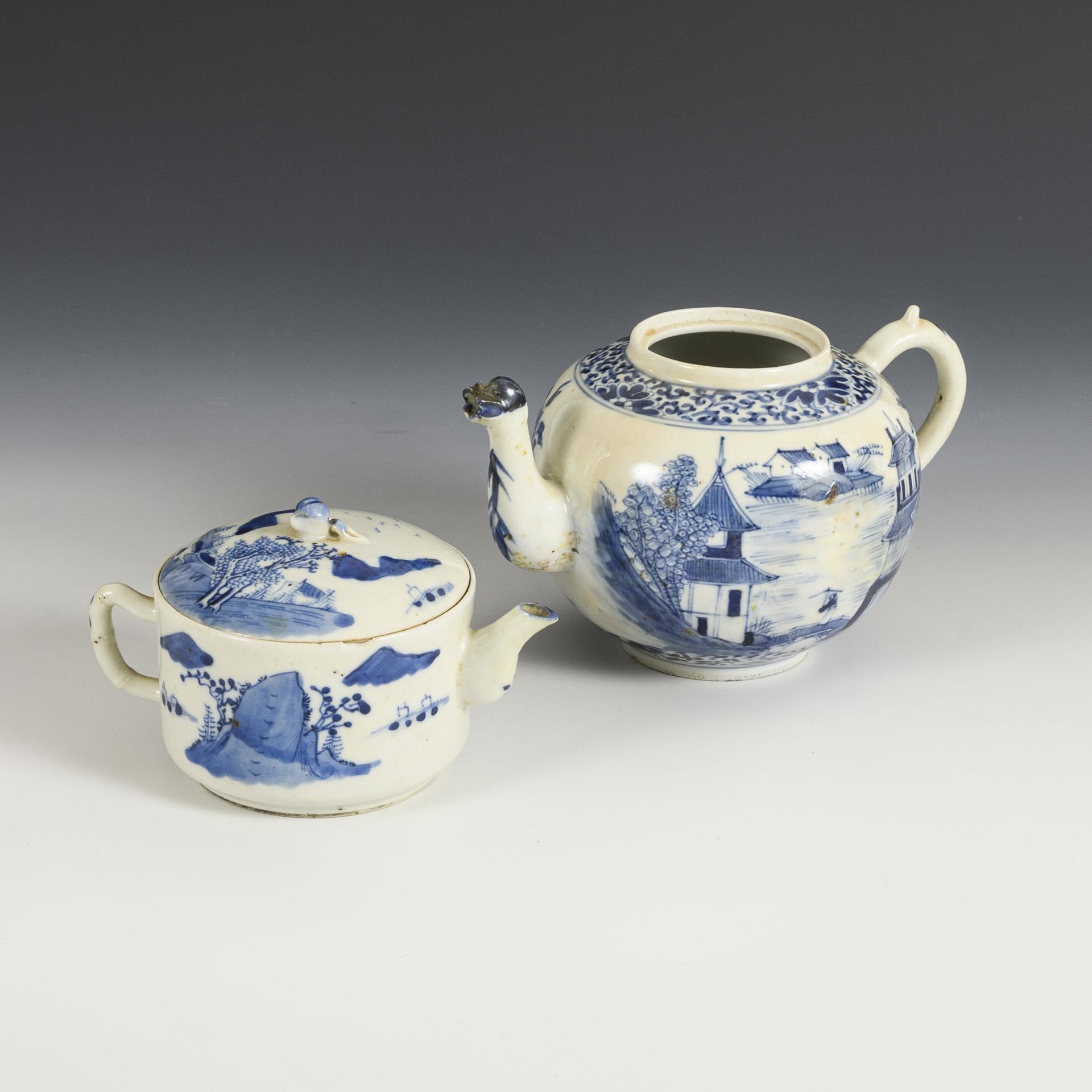 Kugelförmige Kanne mit Tüllenausguss in Tierform und Landschaftsdarstellung. Ohne Deckel, (H 12 cm). / Kleine, zylindrische Kanne. Henkel in Bambusform, Knauf als Pfirsich geformt. Chip am oberen Rand. (H 9 cm).