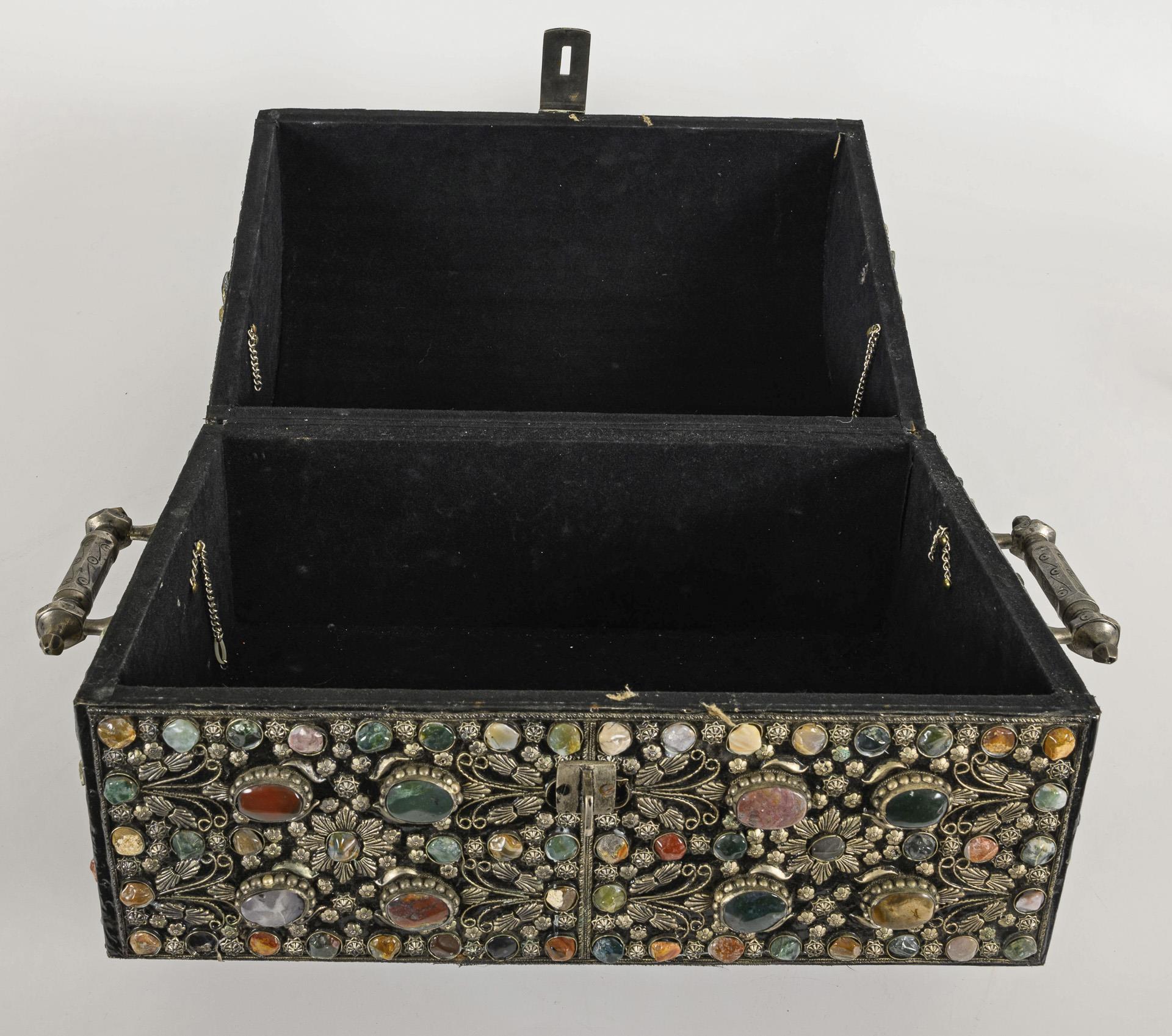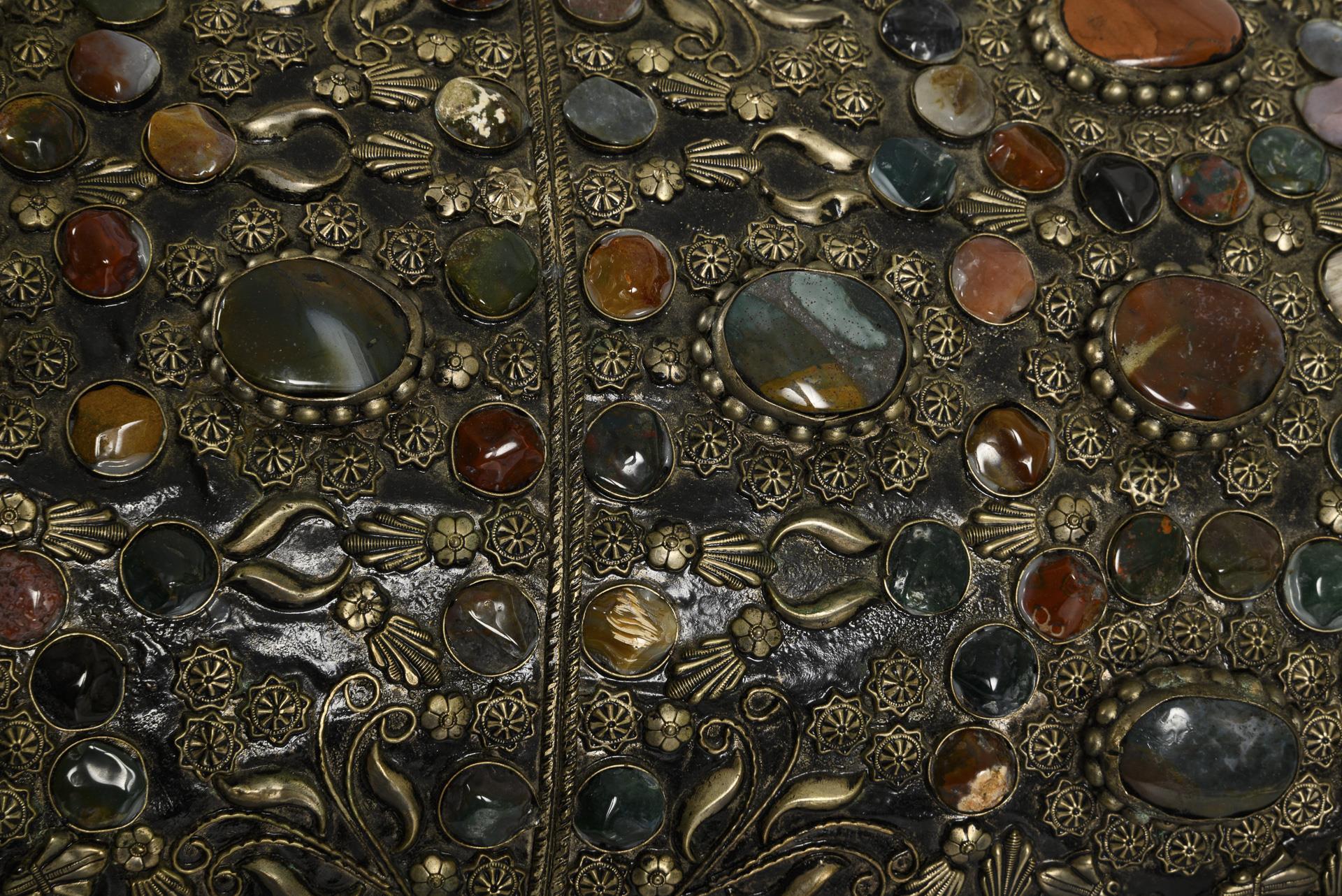 Dekorative Rundbuckeltruhe mit dichtem, vielfarbigem Steinbesatz aus Achat, Jaspis und Aventurin, auf floralem Metallbeschlag. Innen und unten mit schwarzem Samt bezogen. Seitlich zwei massive Griffe. Wohl 2. Hälfte 20. Jahrhundert.