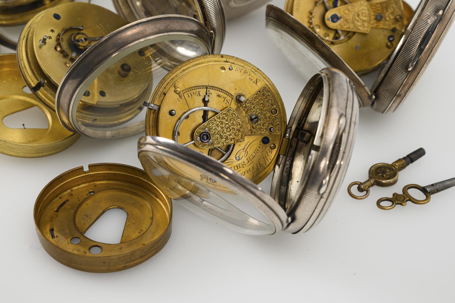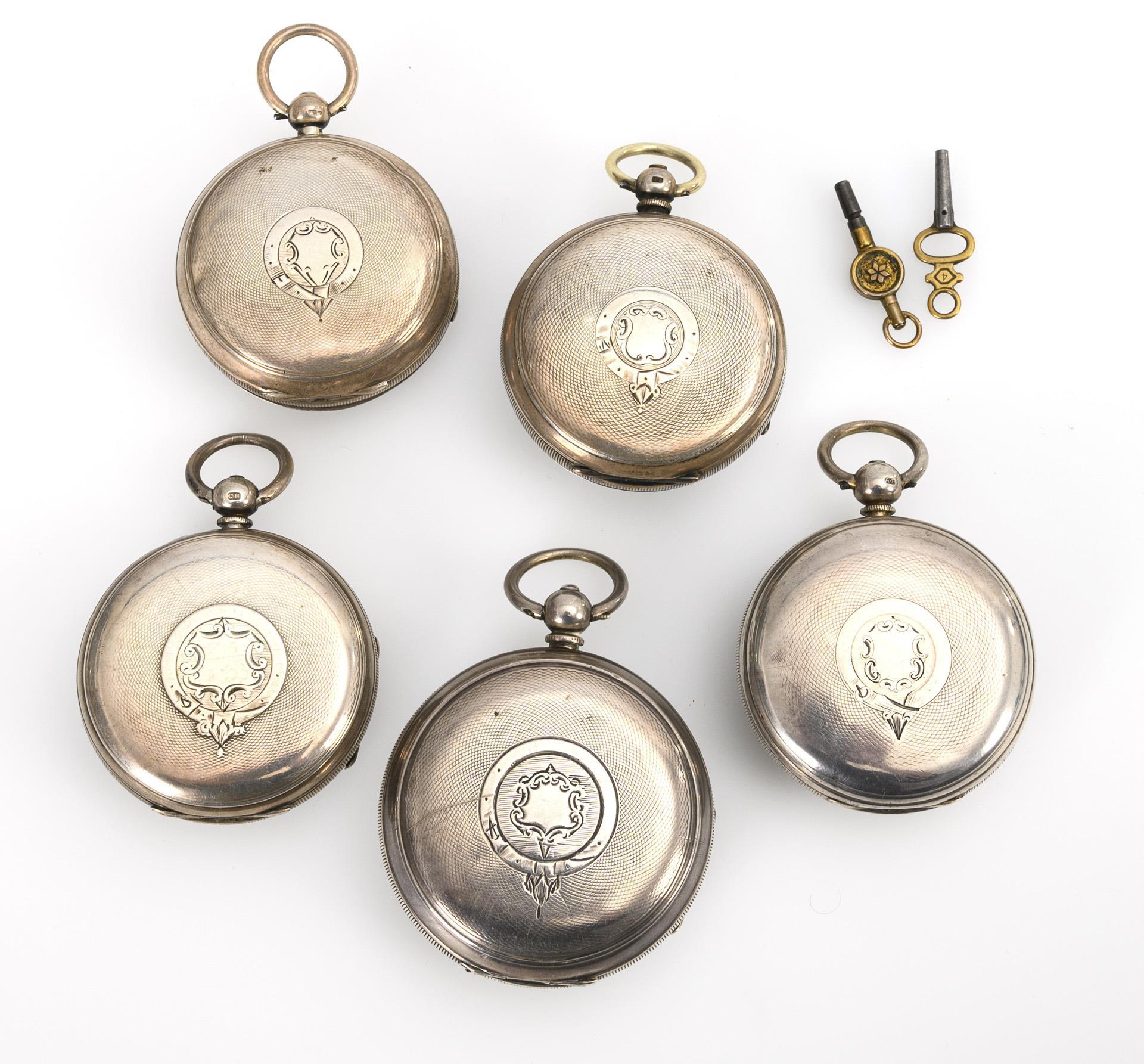 Lépine-Gehäuse mit Münzrand und guillochierten Rückdeckeln mit leeren Wappenreserven. Alters- und Gebrauchsspuren, teils mit Defekten, Ergänzungen, Fehlstellen, 1 Uhr mit losem Sekundenzeiger, 1 Uhr mit losem Staubdeckel.