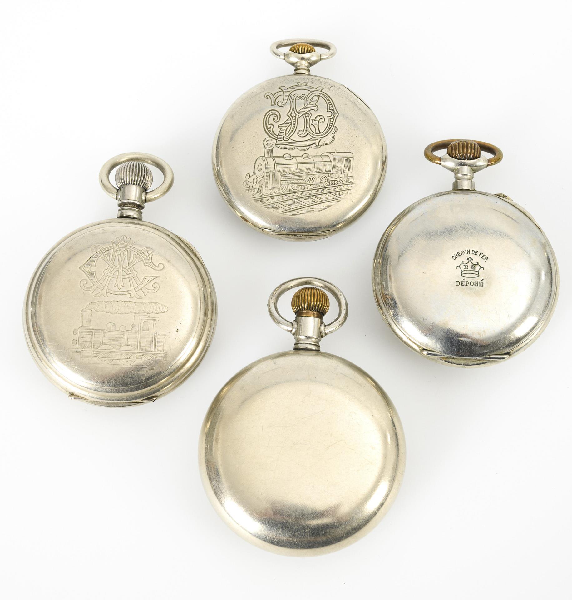 Glatte, teils gravierte Metallgehäuse, 2x mit Eisenbahn-Motiv und ligiertem Monogramm, 1x mit hohem, facettiertem Zifferglas. Omega mit Schraubdeckel. Leichte Alters- und Gebrauchsspuren, teils Defekte.