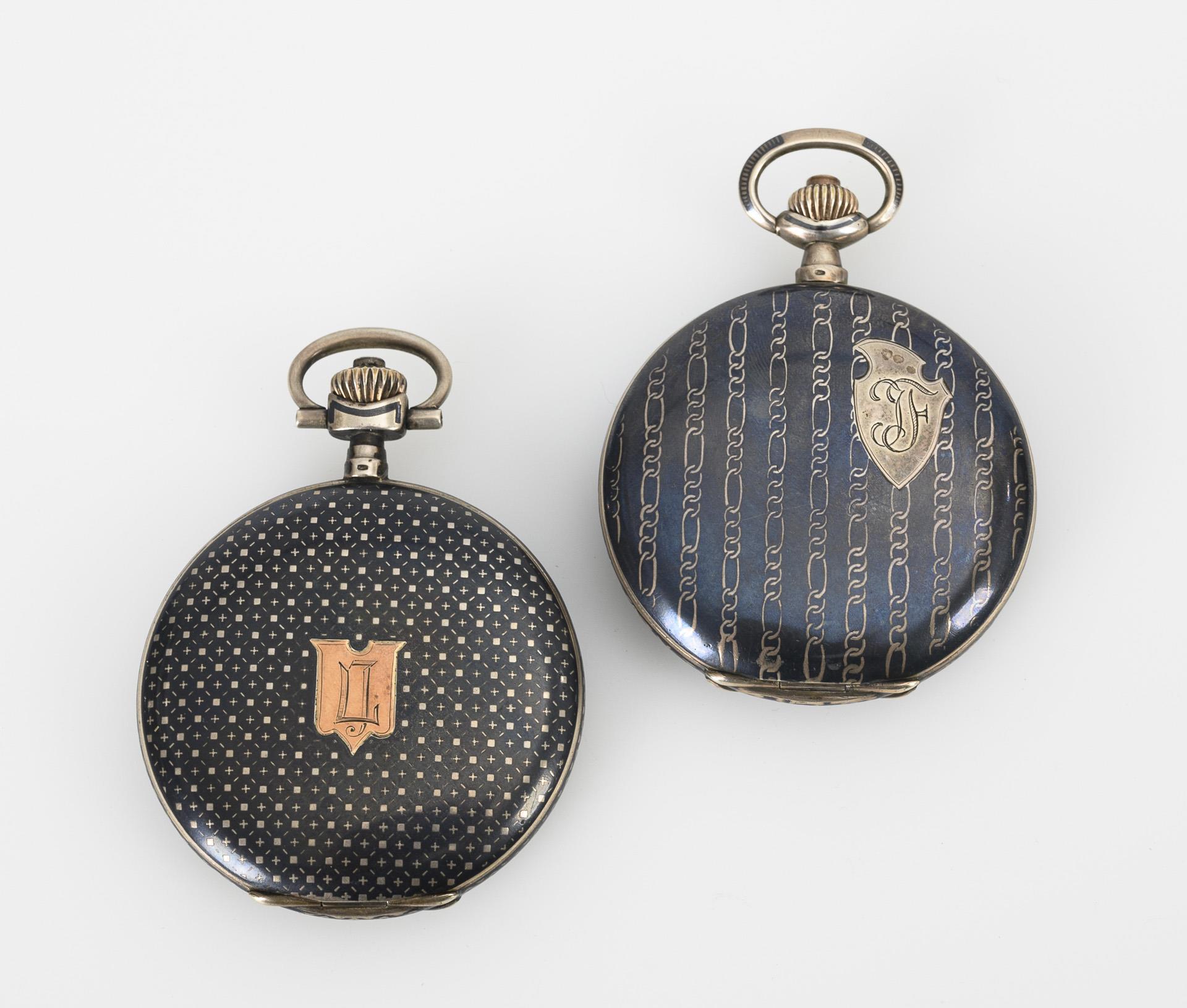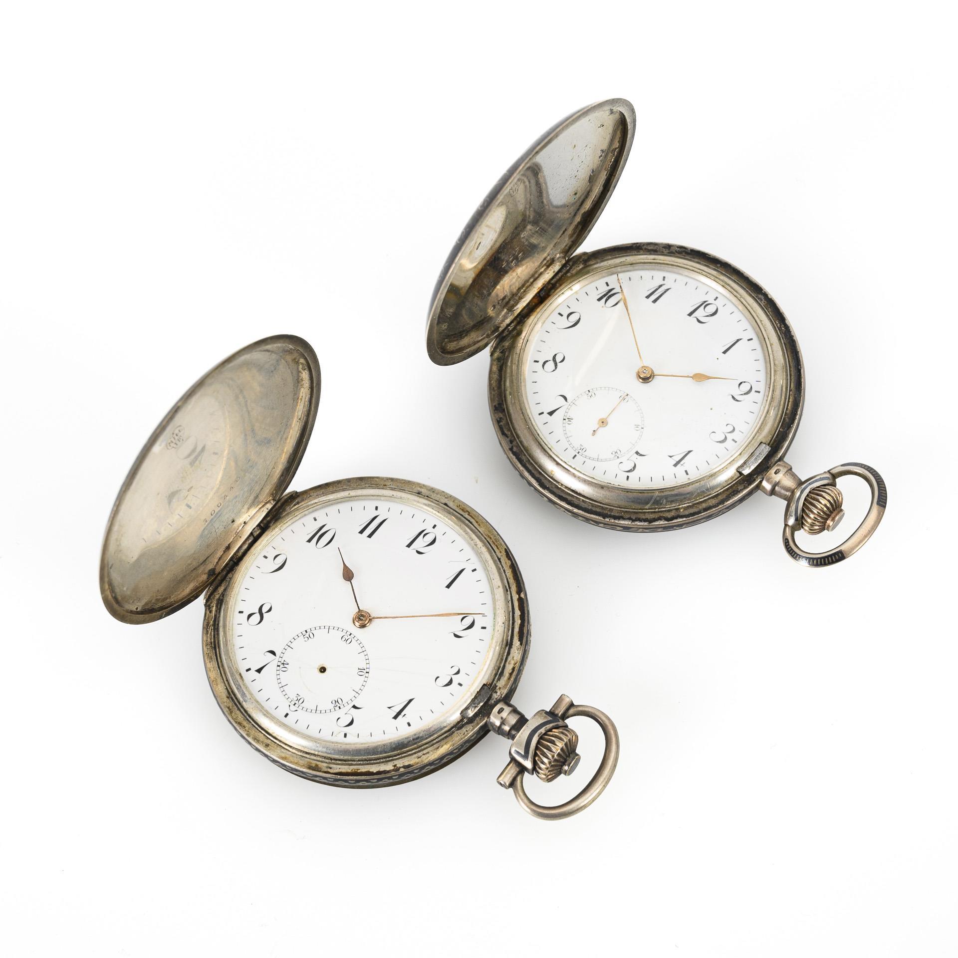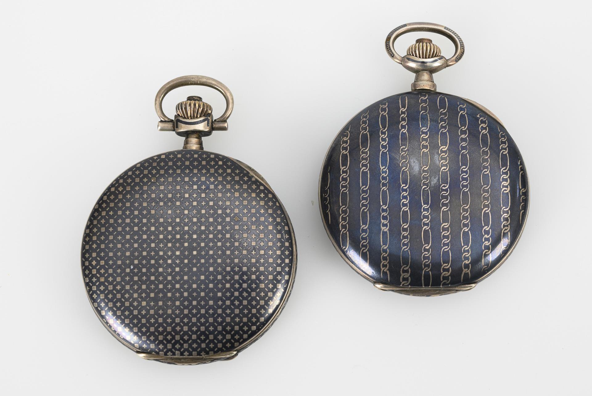 2 silberne Sprungdeckeluhren mit Niello-Dekor.