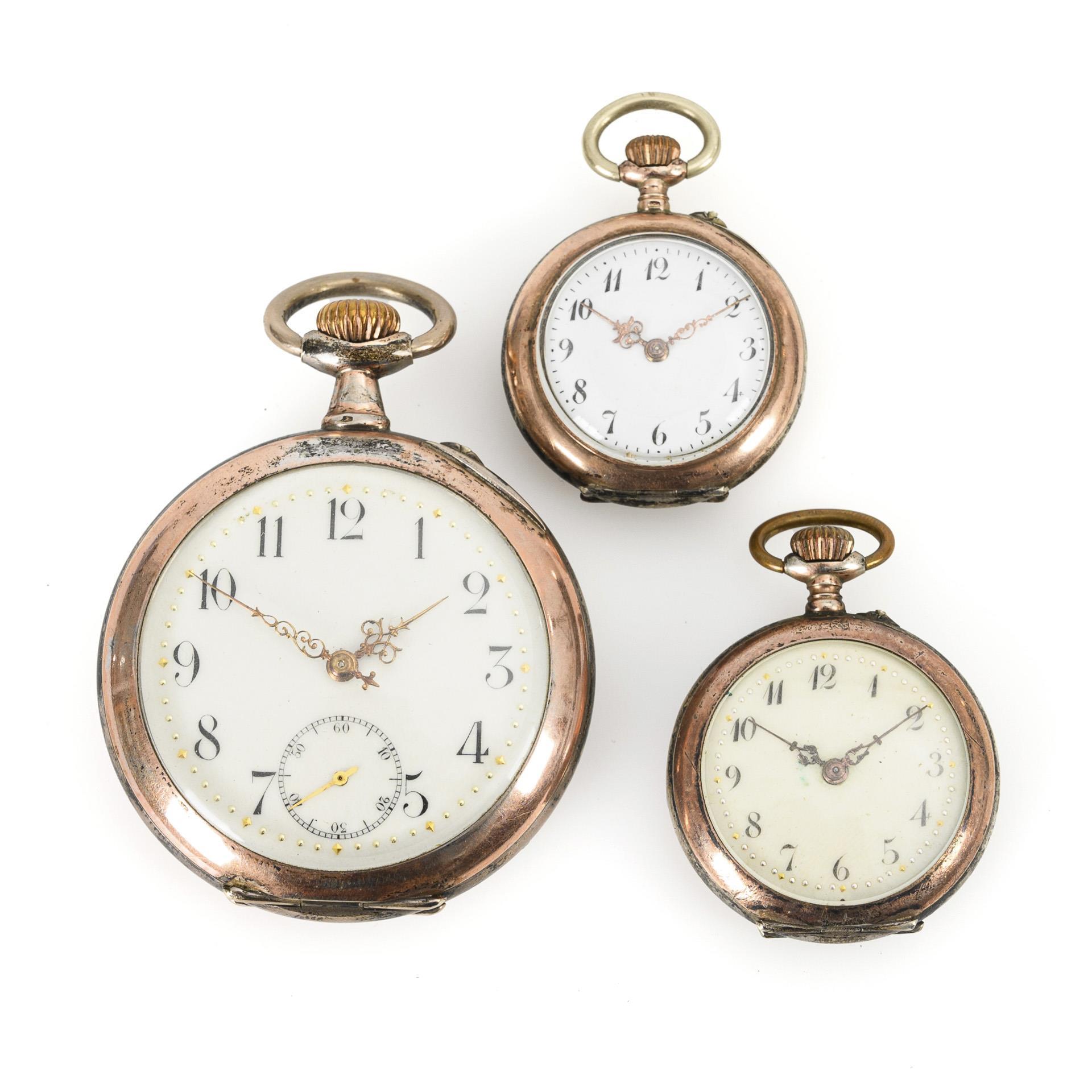 Zylinderwerke mit Reifenunruh und Kronenaufzug. 2 Uhren im Kurzzeittest funktionstüchtig, 1 Uhr läuft nicht. Jeweils mit weißem Emailziffernblatt und arabischen Zahlen.