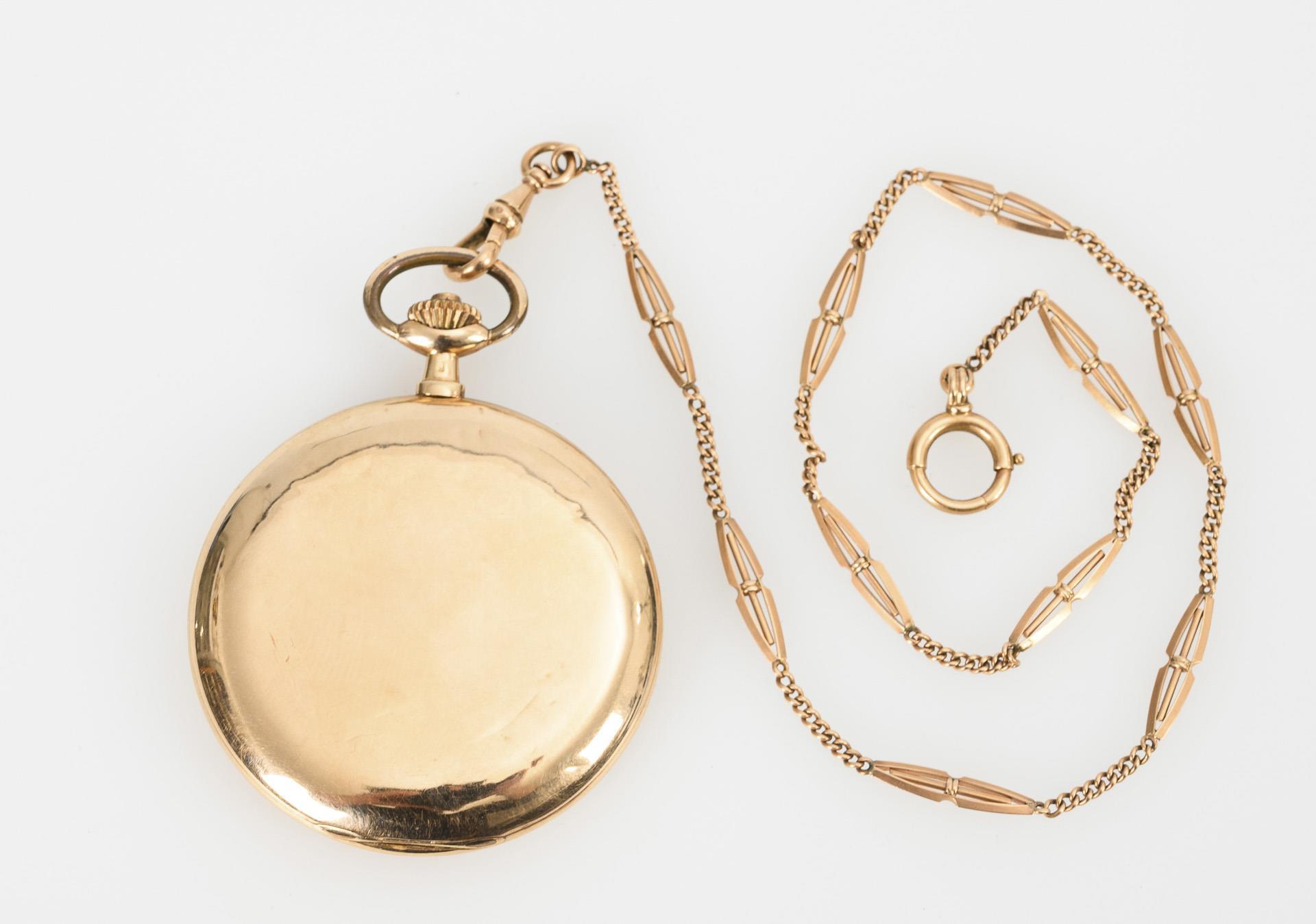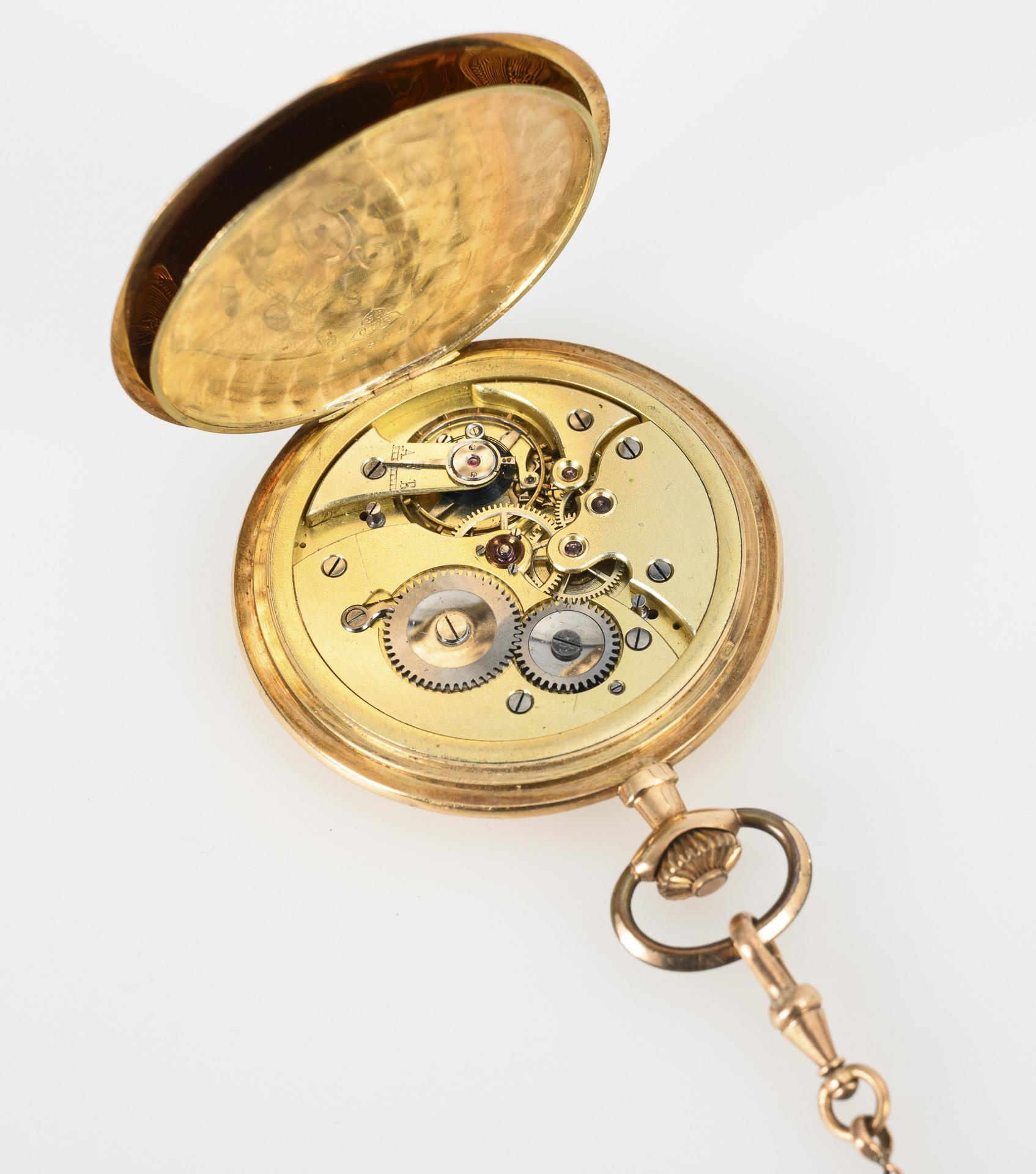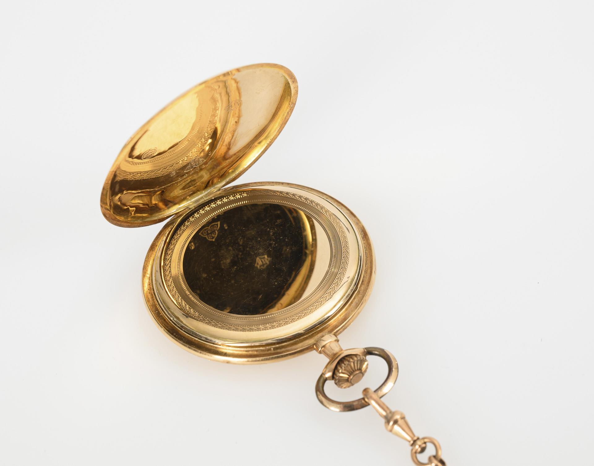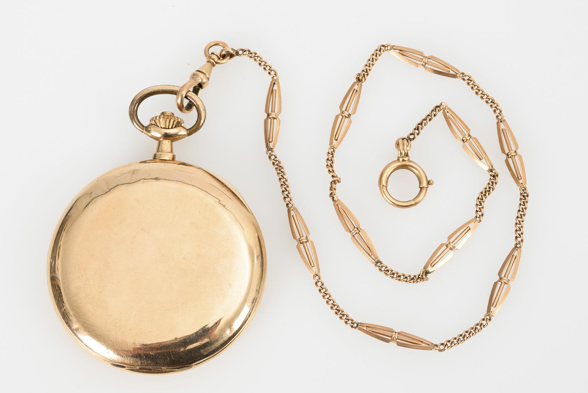 Glattes Gehäuse mit teils ziseliertem Staubdeckel aus Gold. An gepunzter Golduhrenkette mit Ziersegmenten, Karabiner und Federring. Gehäuse gedellt, leichte Altersspuren.