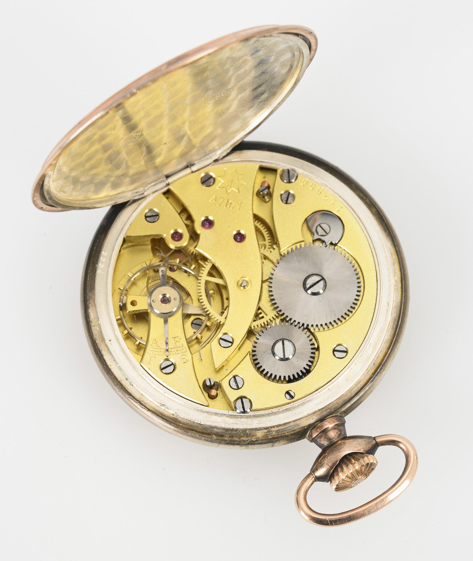 Streifengraviertes Galonné-Gehäuse mit leerer Rechteckreserve, Staubdeckel aus Silber. Minimale Alters- und Gebrauchsspuren.