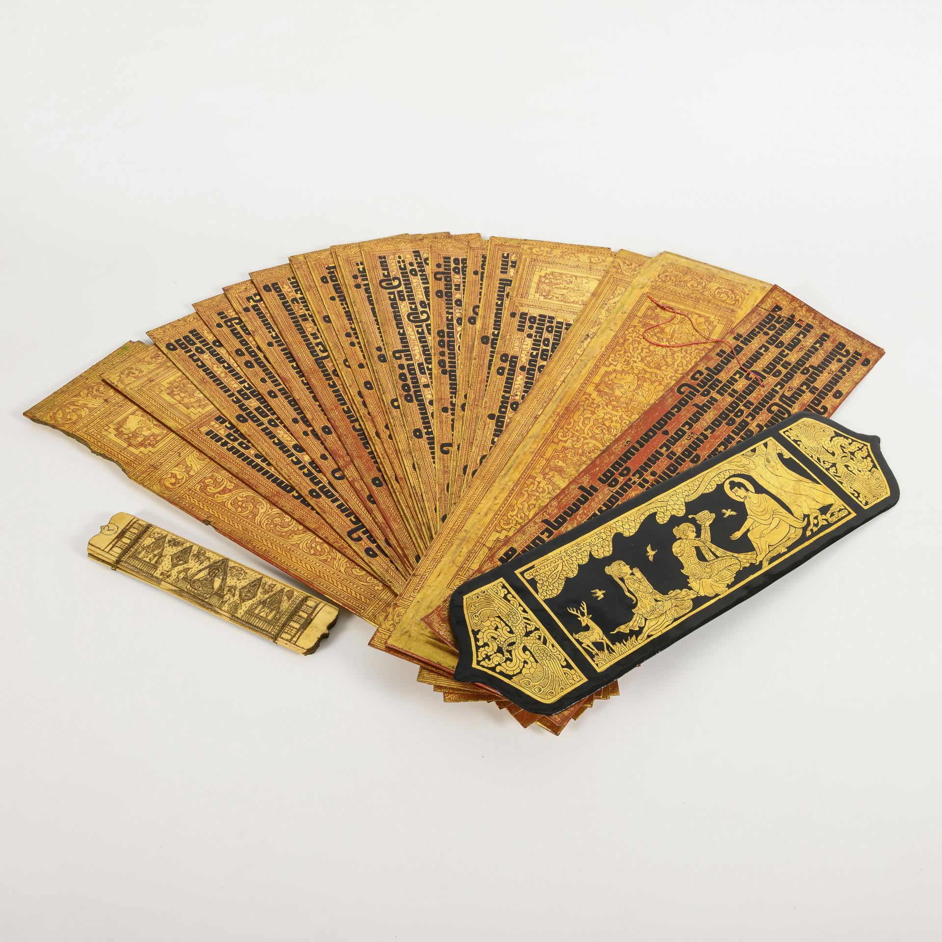 17 Seiten und 2 dickere 'Buchdeckel' mit schwarzer Schrift auf Gold und Rot gefassten, etwas flexiblen Seiten. Bindung nicht vorhanden. Dazugehöriges Tuch in Rot und Grün mit zahlreichen Löchern. Dazu eine goldfarbene Zeichnung auf Schwarz, in Lack ausgeführt (51 x 13 cm) und kleines, zweiteiliges Palmblattbuch (24 x 5 cm). Ein Blatt mit Knickspur, Deckel mit bestoßenen Kanten.