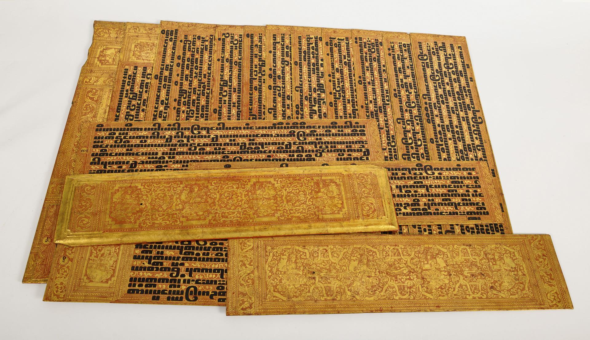 17 Seiten und 2 dickere 'Buchdeckel' mit schwarzer Schrift auf Gold und Rot gefassten, etwas flexiblen Seiten. Bindung nicht vorhanden. Dazugehöriges Tuch in Rot und Grün mit zahlreichen Löchern. Dazu eine goldfarbene Zeichnung auf Schwarz, in Lack ausgeführt (51 x 13 cm) und kleines, zweiteiliges Palmblattbuch (24 x 5 cm). Ein Blatt mit Knickspur, Deckel mit bestoßenen Kanten.