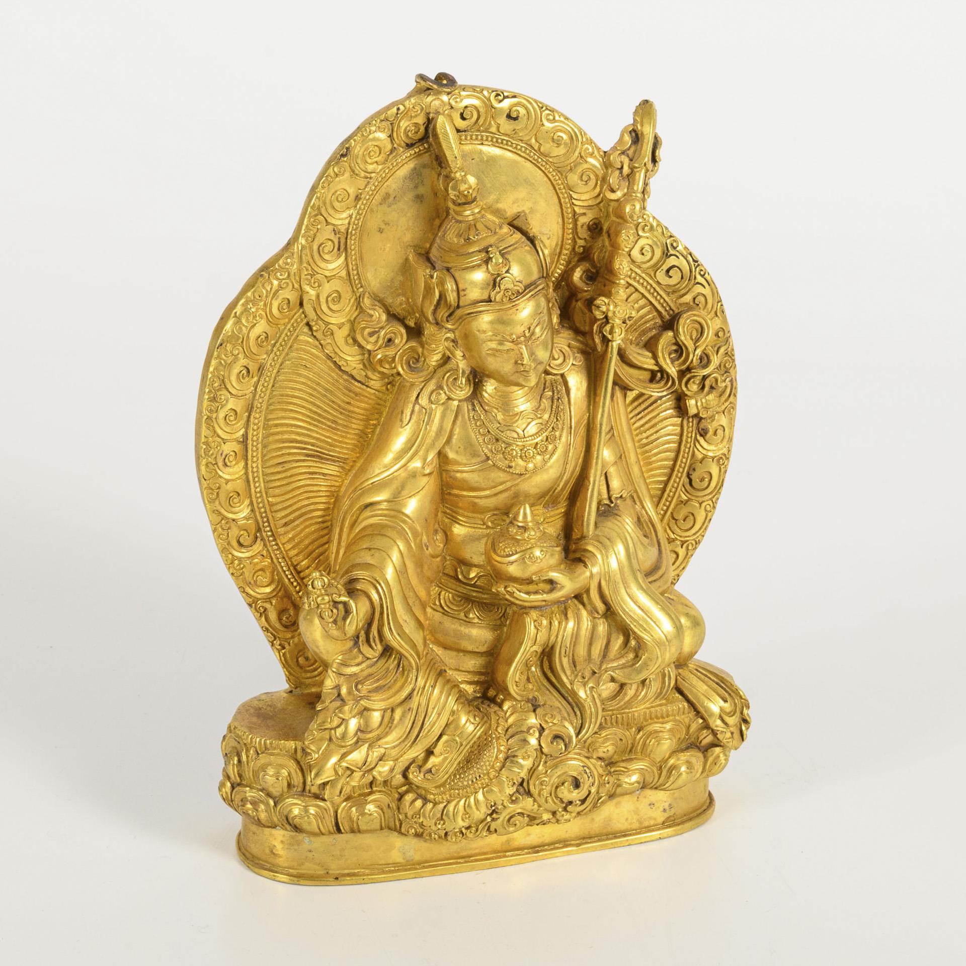 Im lockeren Sitz ruhende Figur, auf doppeltem Lotussockel. In den Händen Zepter, Dose und Vajra. Doppelter Nimbus und Helmzier. Rück- und Unterseite verschlossen. Sorgfältige Ausführung mit reicher Ornamentierung. Öse etwas verbogen.