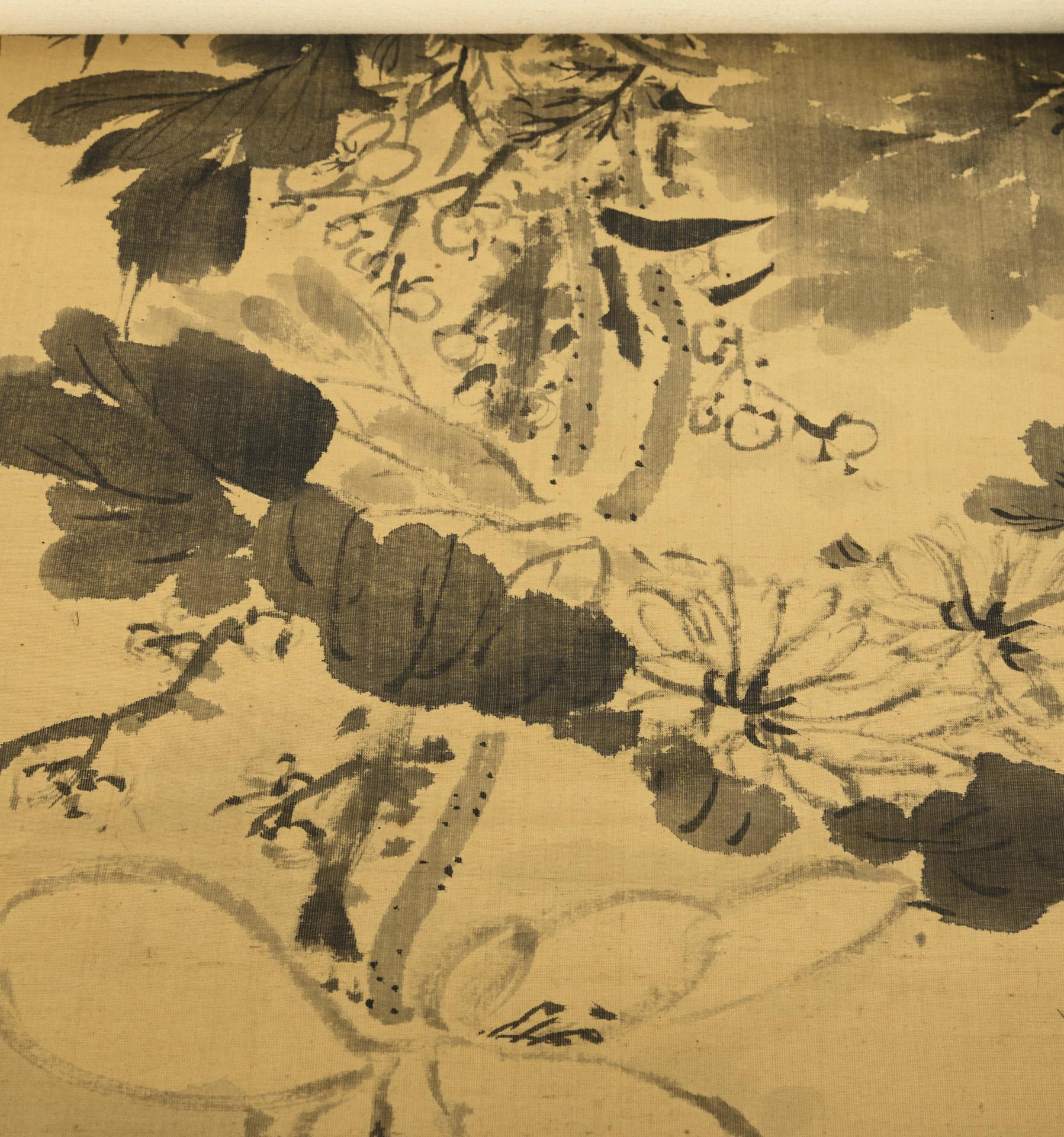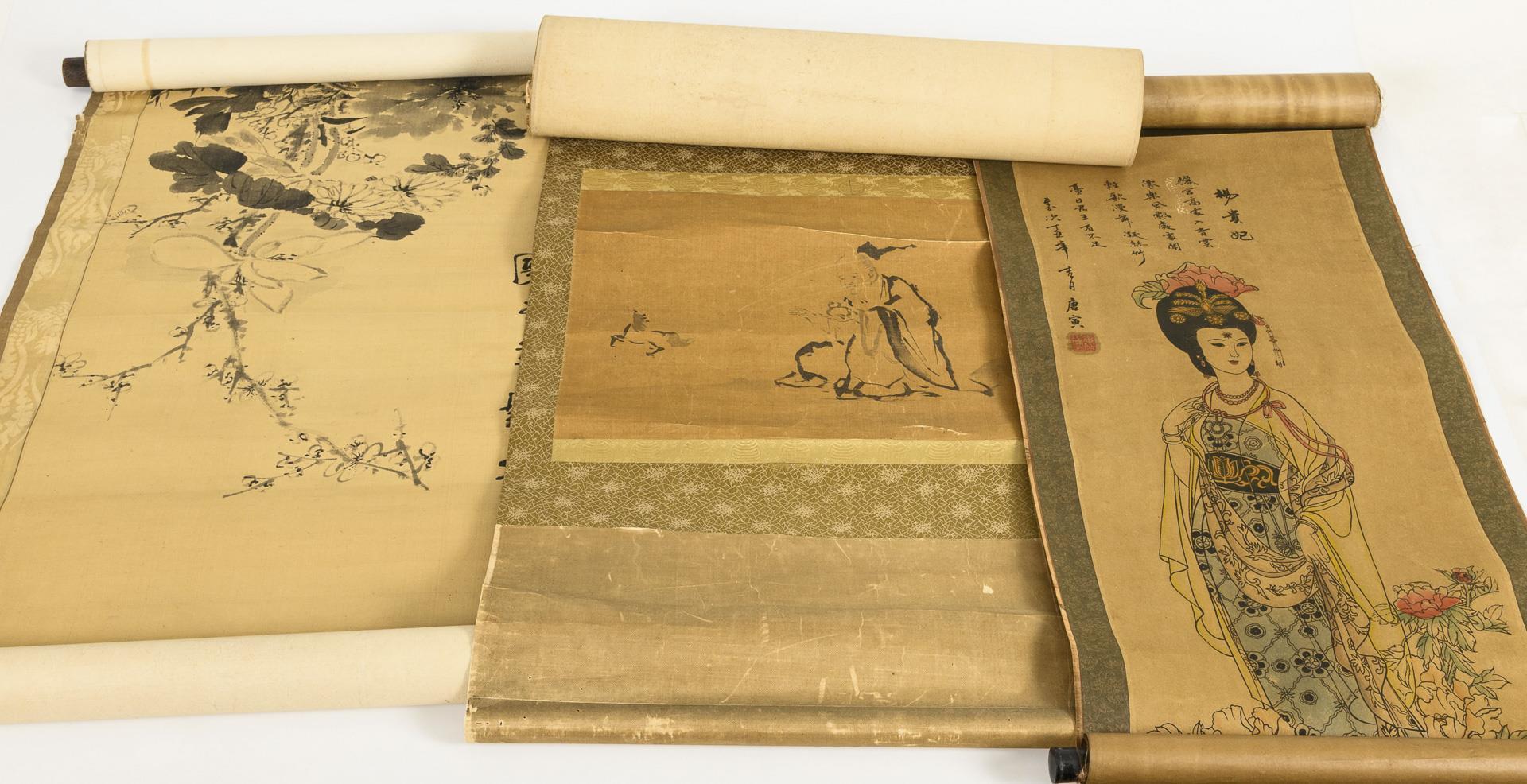 Pflanzenstillleben, Tuschzeichnung auf Seide, (165 x 54 cm). / Junge geschmückt Frau zwischen Blüten. Farbholzschnitt auf Papier. (136 x 37 cm). / Gelehrter auf Kranich. Wohl Malerei auf Papier. (155 x 38 cm). / Gelehrter, wohl Tusche auf Seide. (114 x 54 cm). / Landschaft mit See und Bergen, wohl Tuschzeichnung auf Papier. Im beschrifteten Holzkasten. (206 x 25 cm). Alle mit unterschiedlich starken Alters- und Gebrauchsspuren.