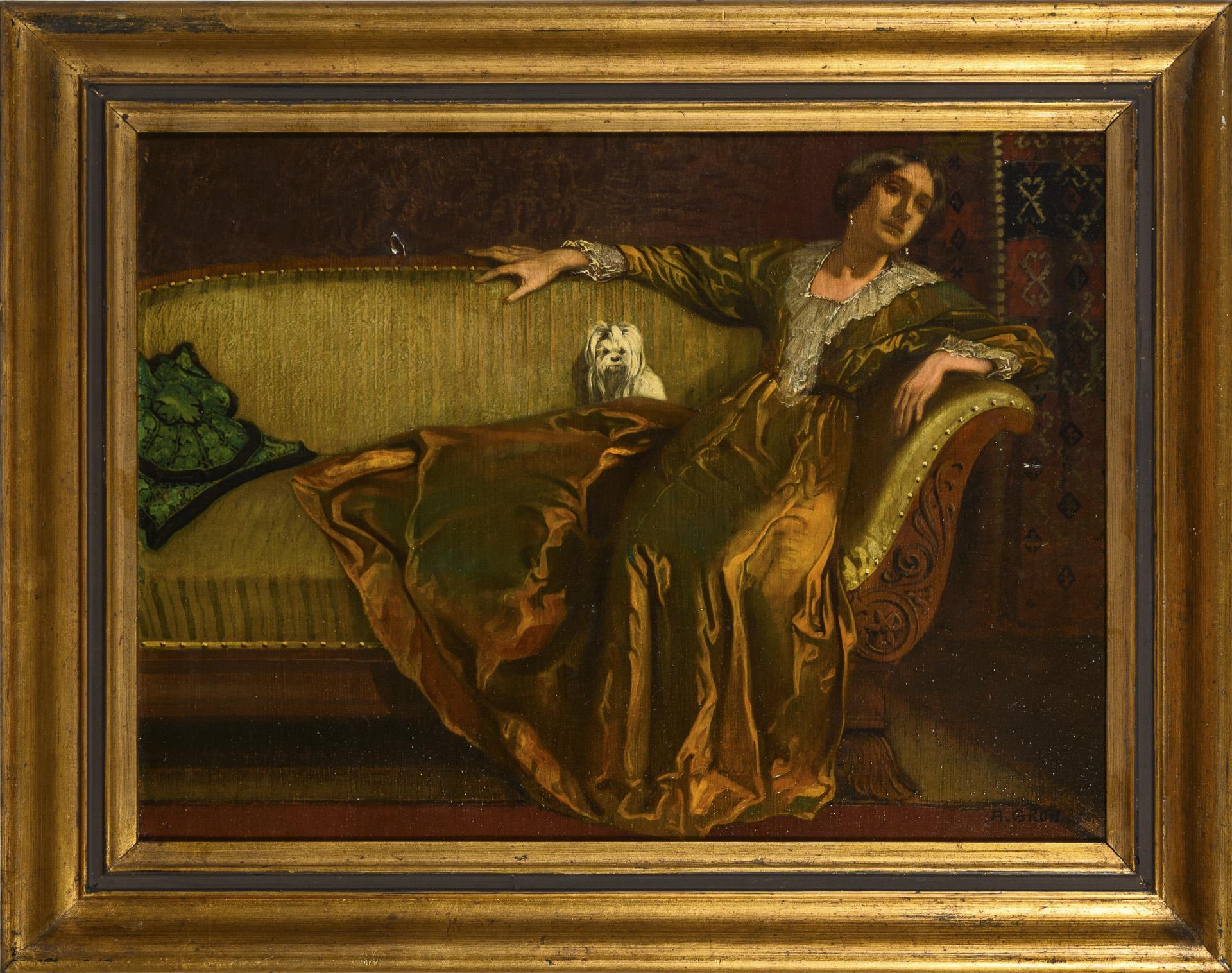 In goldenem Kleid auf dem Sofa sitzende junge Frau mit einem Pekinesen. Altersspuren.