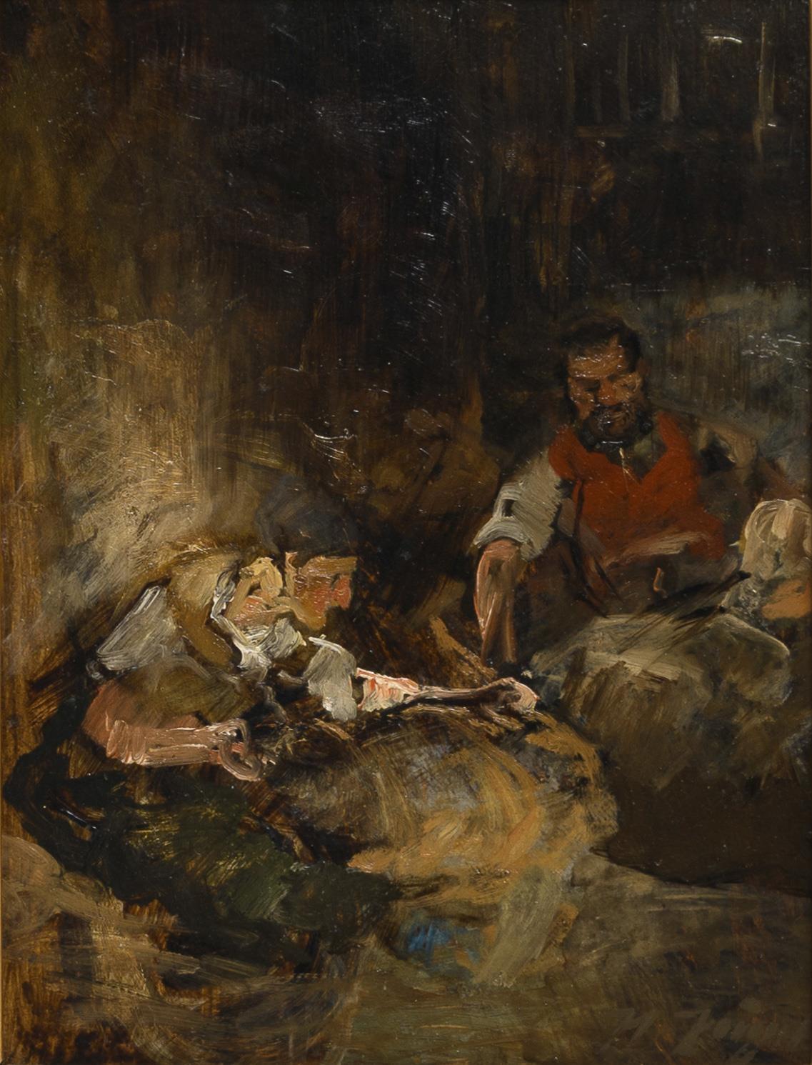 Expressiv gemalte Studie mit dem Bauernpaar und den schemenhaft erkennbaren Tieren vor der Wand des Stalls. Minimale Altersspuren.