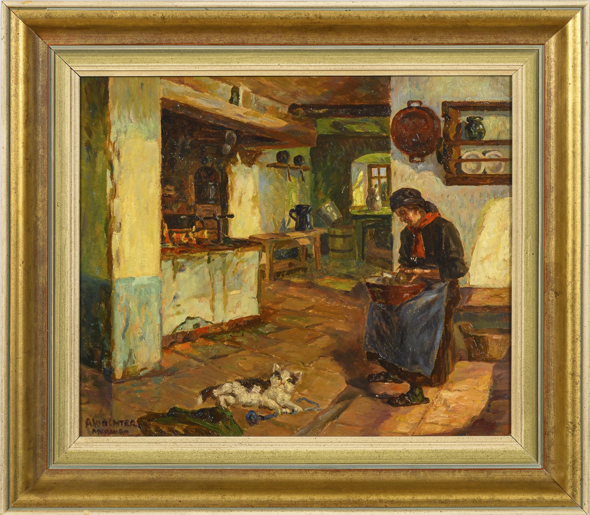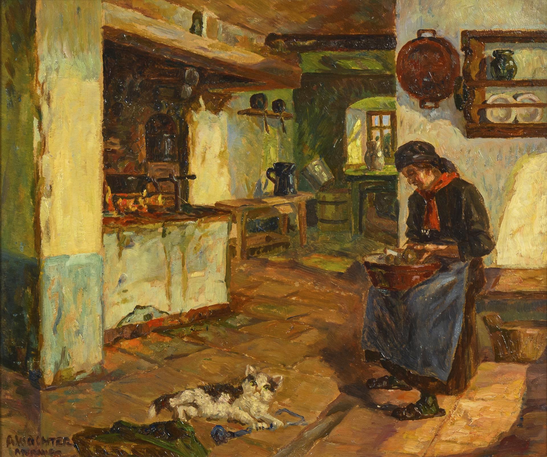 Bäuerin bei der Küchenarbeit nebst einer Katze auf dem Boden.