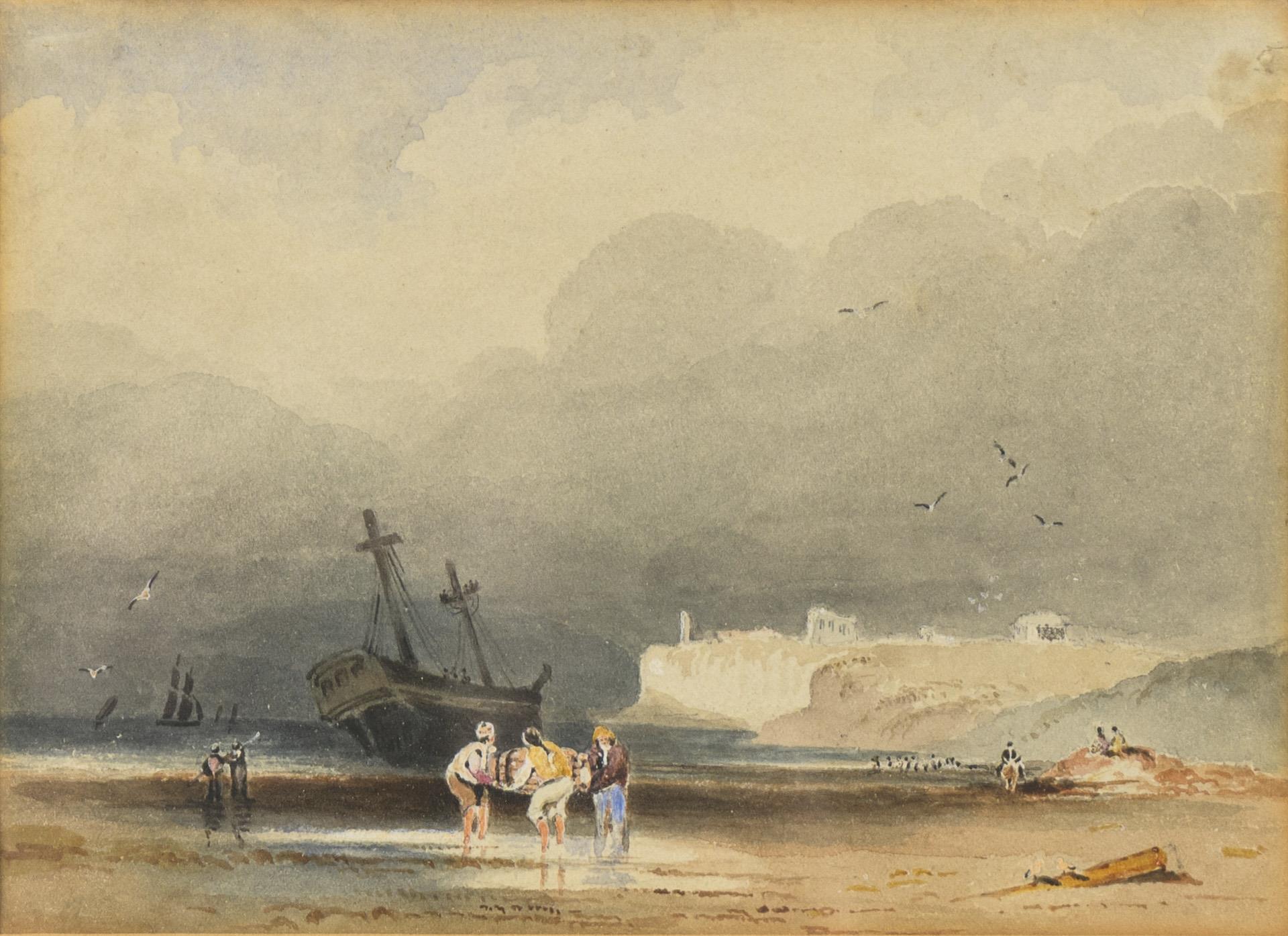 Staffagefiguren am Strand nahe einem Schiff bei aufziehenden dunklen Wolken. Riss in einer Ecke.