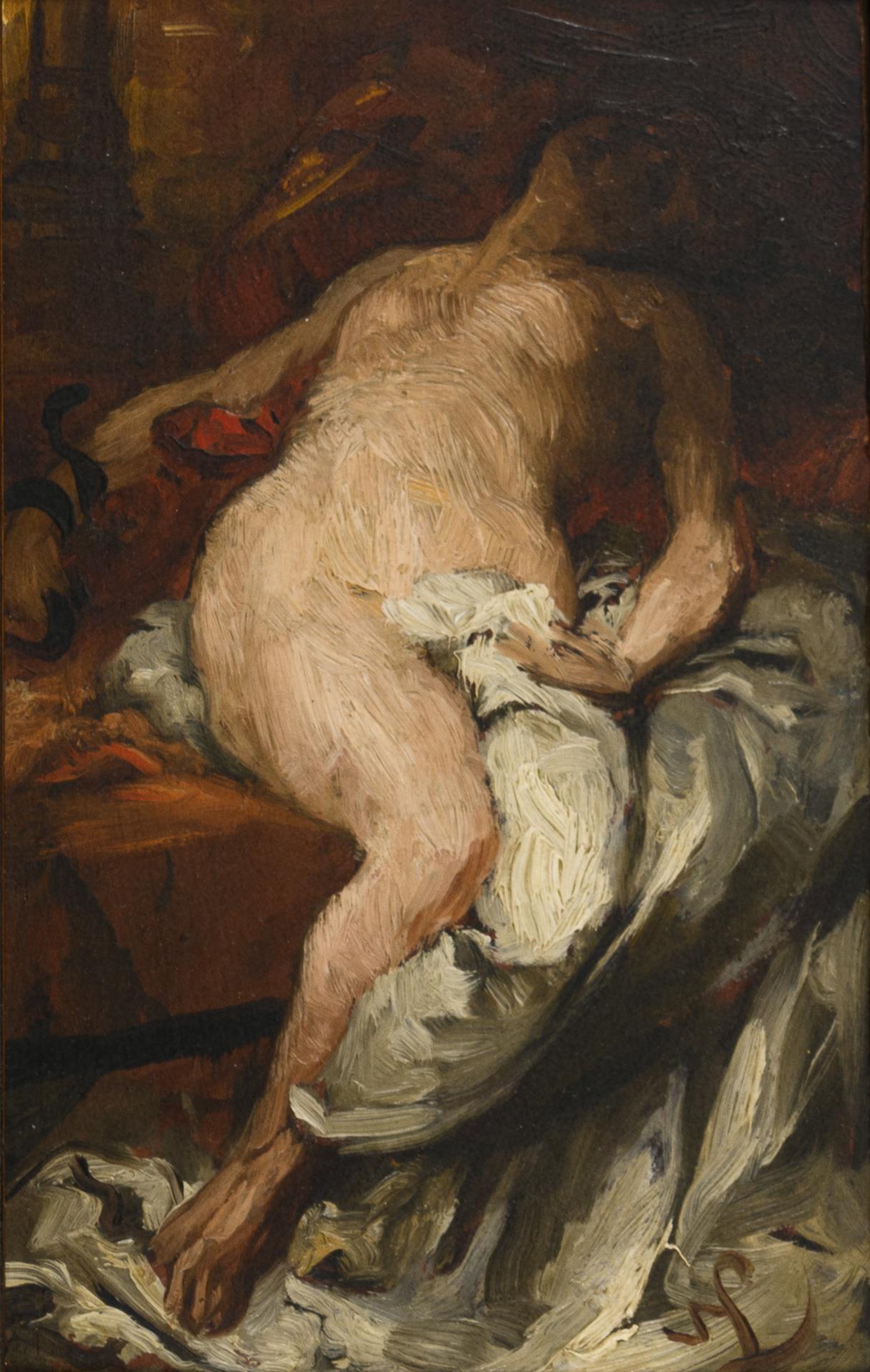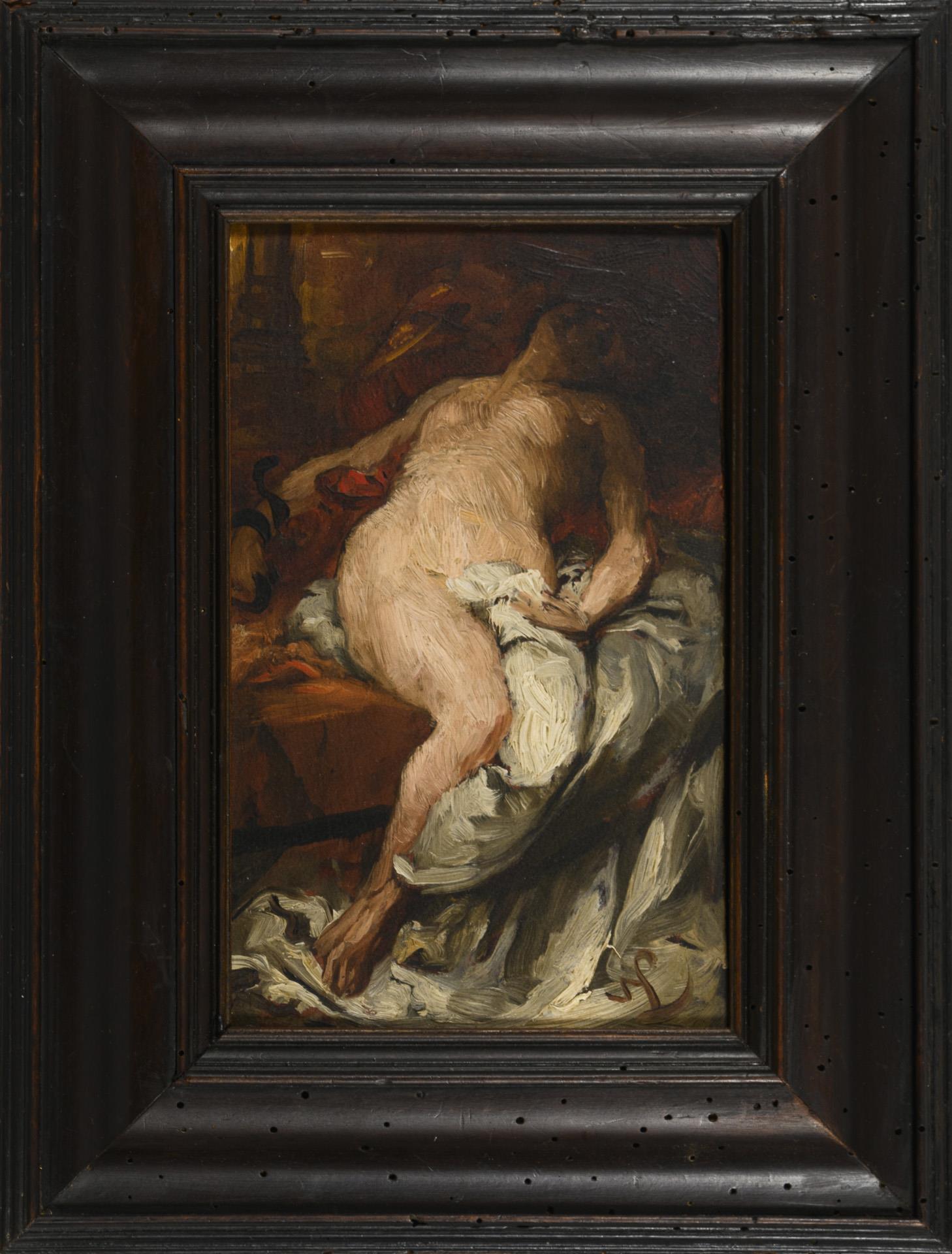 Auf einem Bett liegender Frauenakt im hellen Licht.