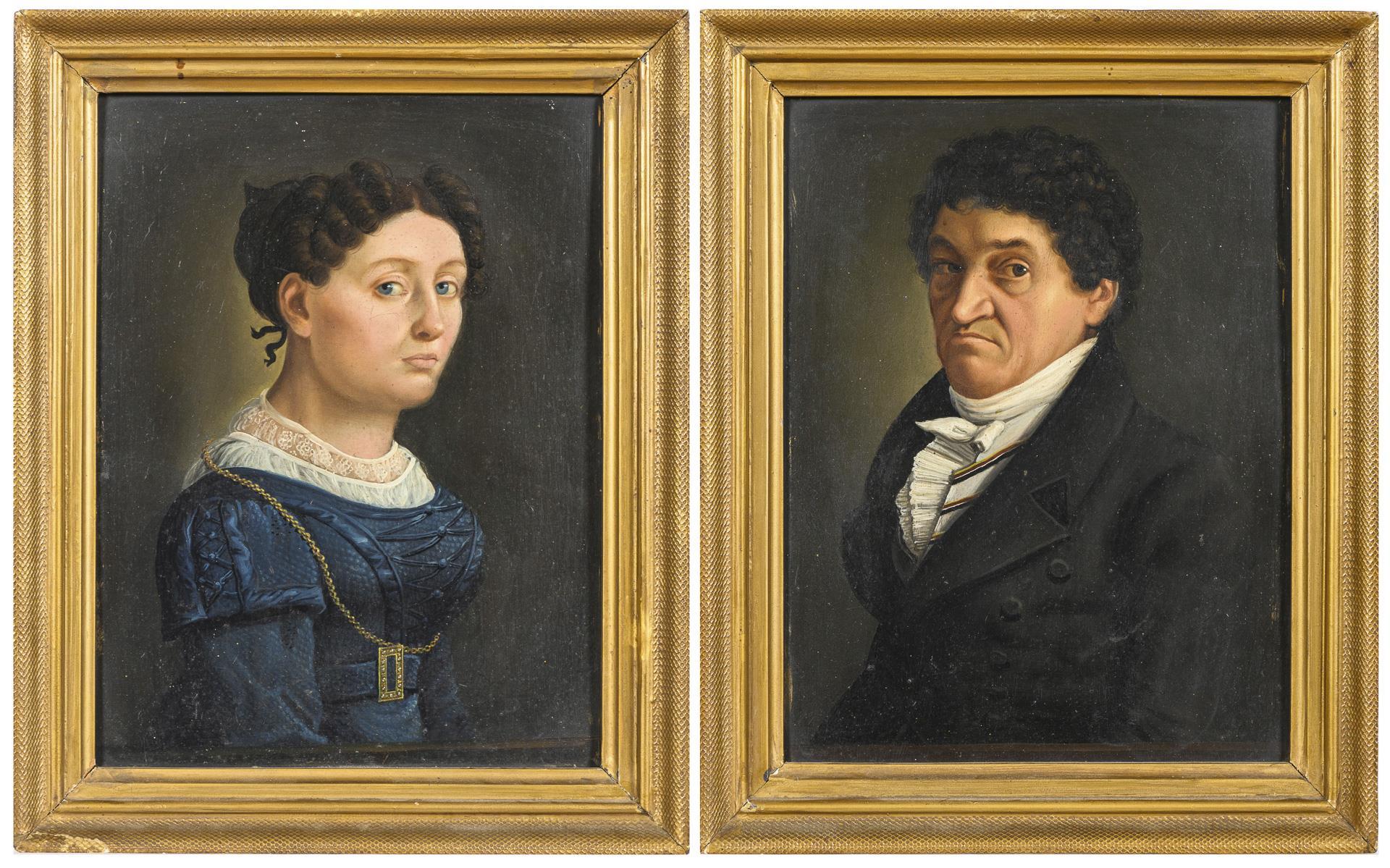 Qualitativ hochwertige Bildnisse einer jungen Frau in blauem Kleid sowie eines Mannes in schwarzem Gehrock. Es handelt sich um das Ehepaar Fichtbauer aus Coburg. Je leichte Altersspuren.