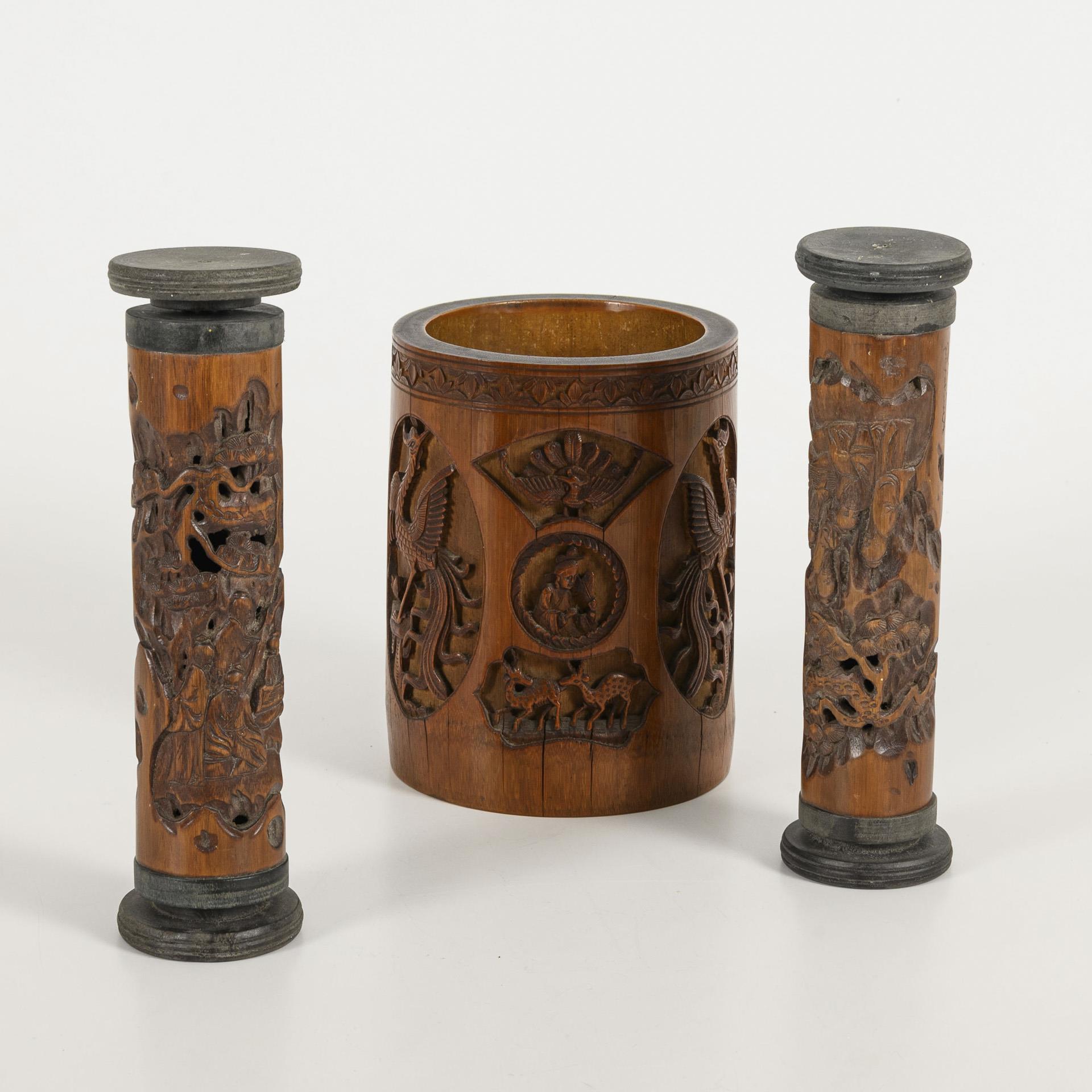Großer Behälter mit sehr feinem Schnitzrelief, einer großen vielfigurigen Kartusche und mehreren Kleineren, wohl Pinselbecher. Signiert, kleinere Trockenrisse. (H 17,5 cm). / 2 beschnitzte und durchbrochen gearbeitete Behälter mit abnehmbaren Holzstopfen, eventuell für Grillen. Paar mit gleicher Gelehrtengruppe auf beiden Stücken. (H 24 cm).