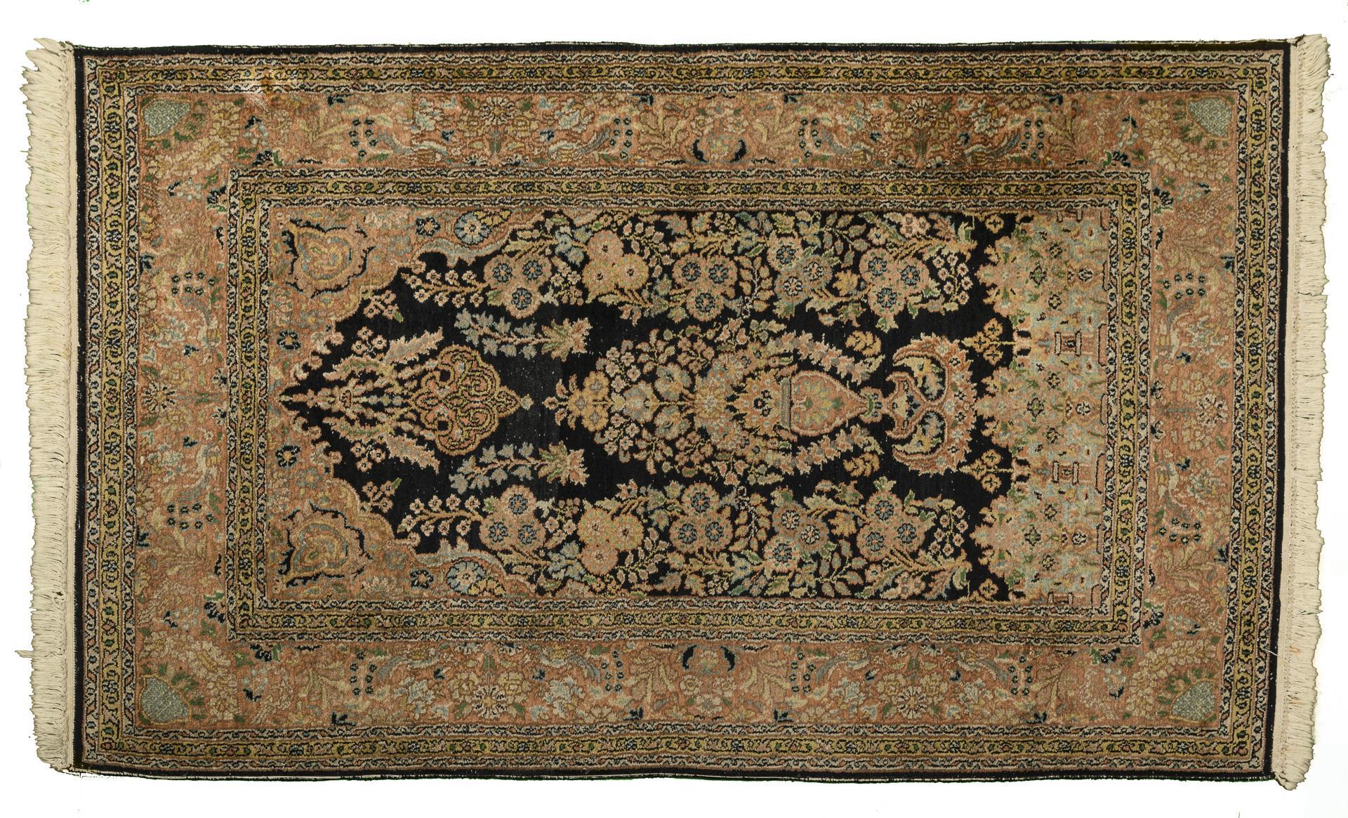 Seide auf Baumwolle, sehr feine Handknüpfung. Polychromer Pastellfarbendekor. Ca. 93 x 155 cm.