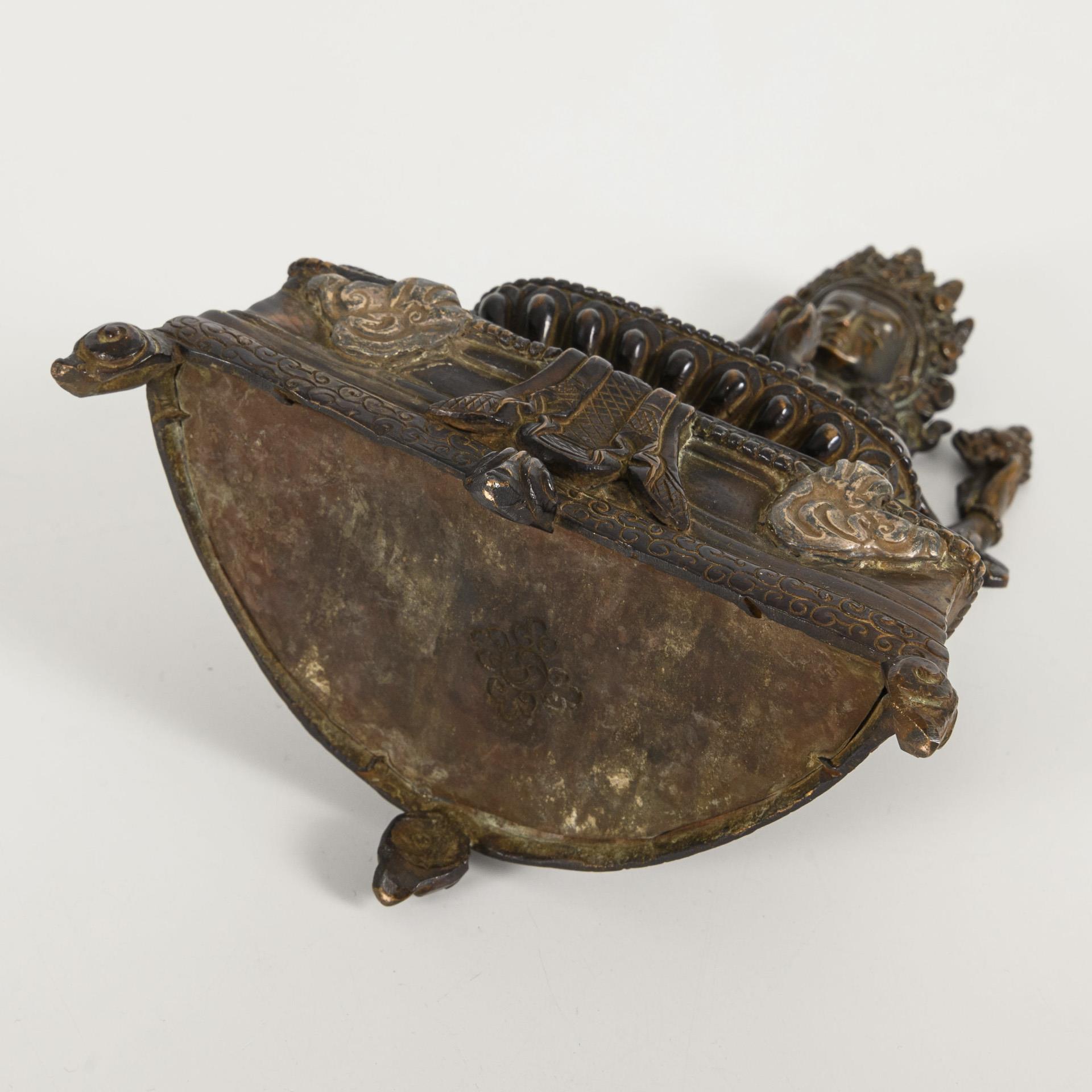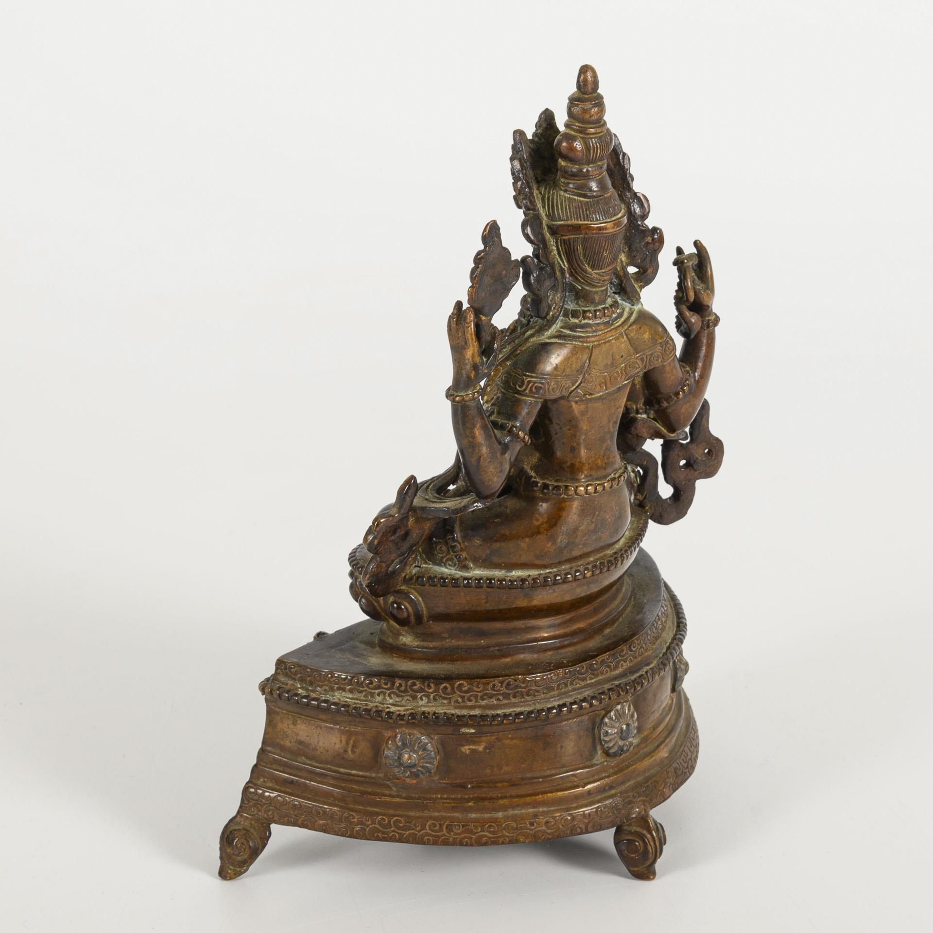 Qualitätvolle, vierarmige Figur im Verschränkungssitz, auf hohem Sockel mit schmückendem Beiwerk. Boden verschlossen.