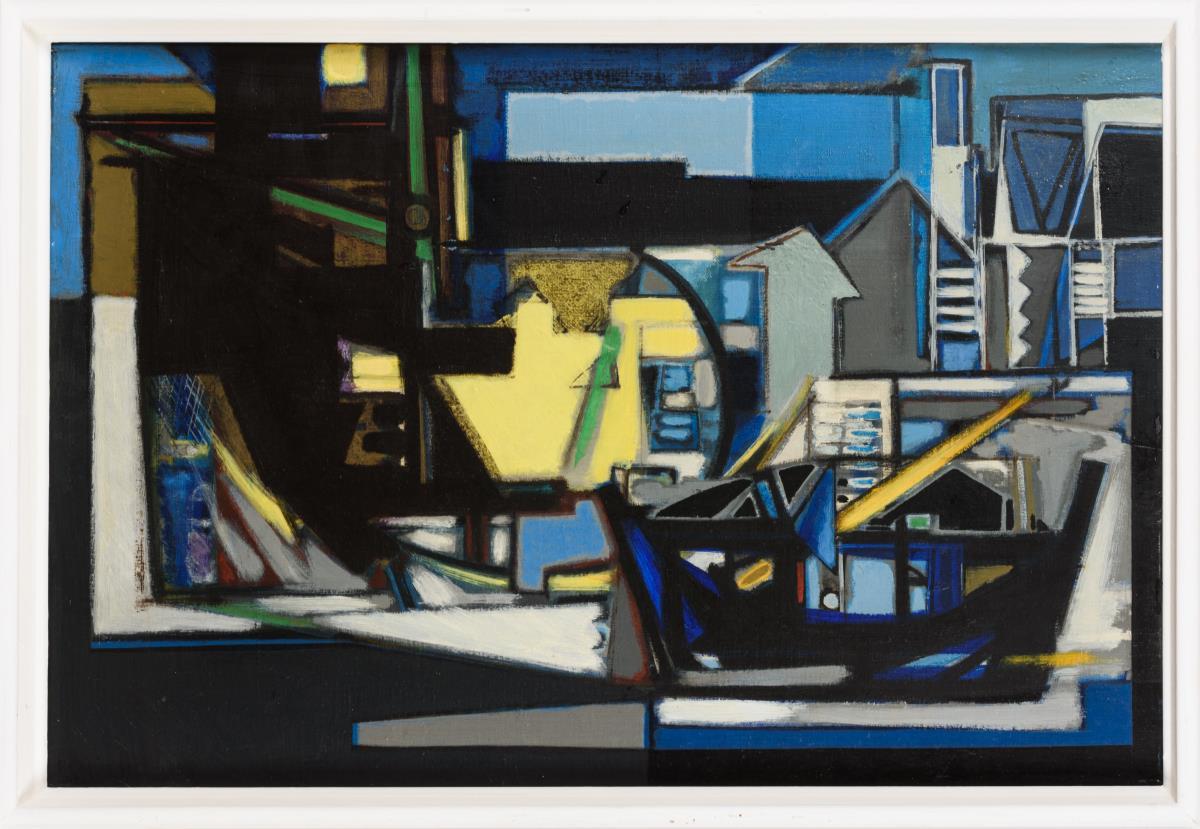 Expressiv und abstrakt gemalte Hafenstadt mit einem Schiff vor den dicht stehenden Häusern.
