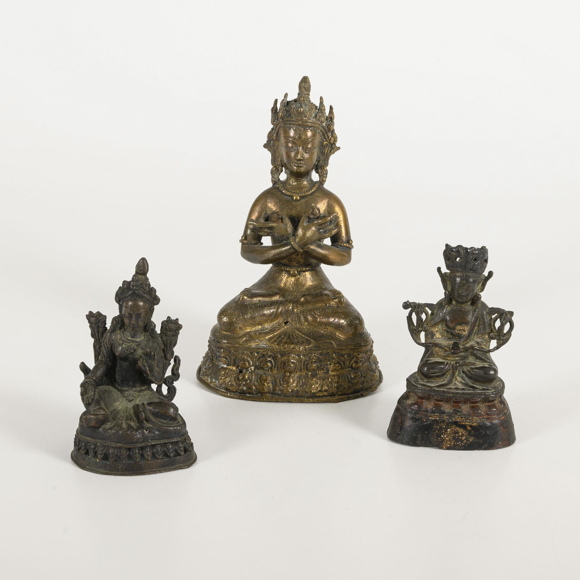 Größere Figur im Verschränkungssitz, mit gekreuzten Armen, in den Händen Glocke und Vajra. (H 19 cm). / Kleine Figur im lockeren Sitz mit Lotusblüten an den Schultern, dunkle Patina. (H 12 cm). / Stilisierte Figur im Verschränkungssitz, die Hände im Meditationsgestus, auf den Schultern wohl Vögel. (H 12 cm).
