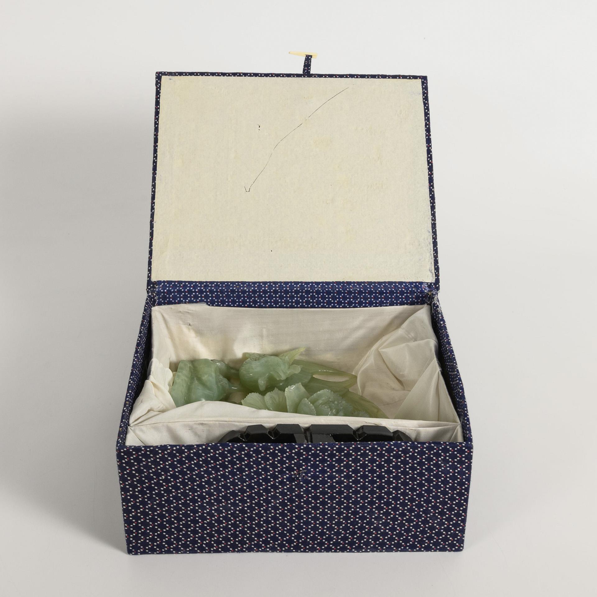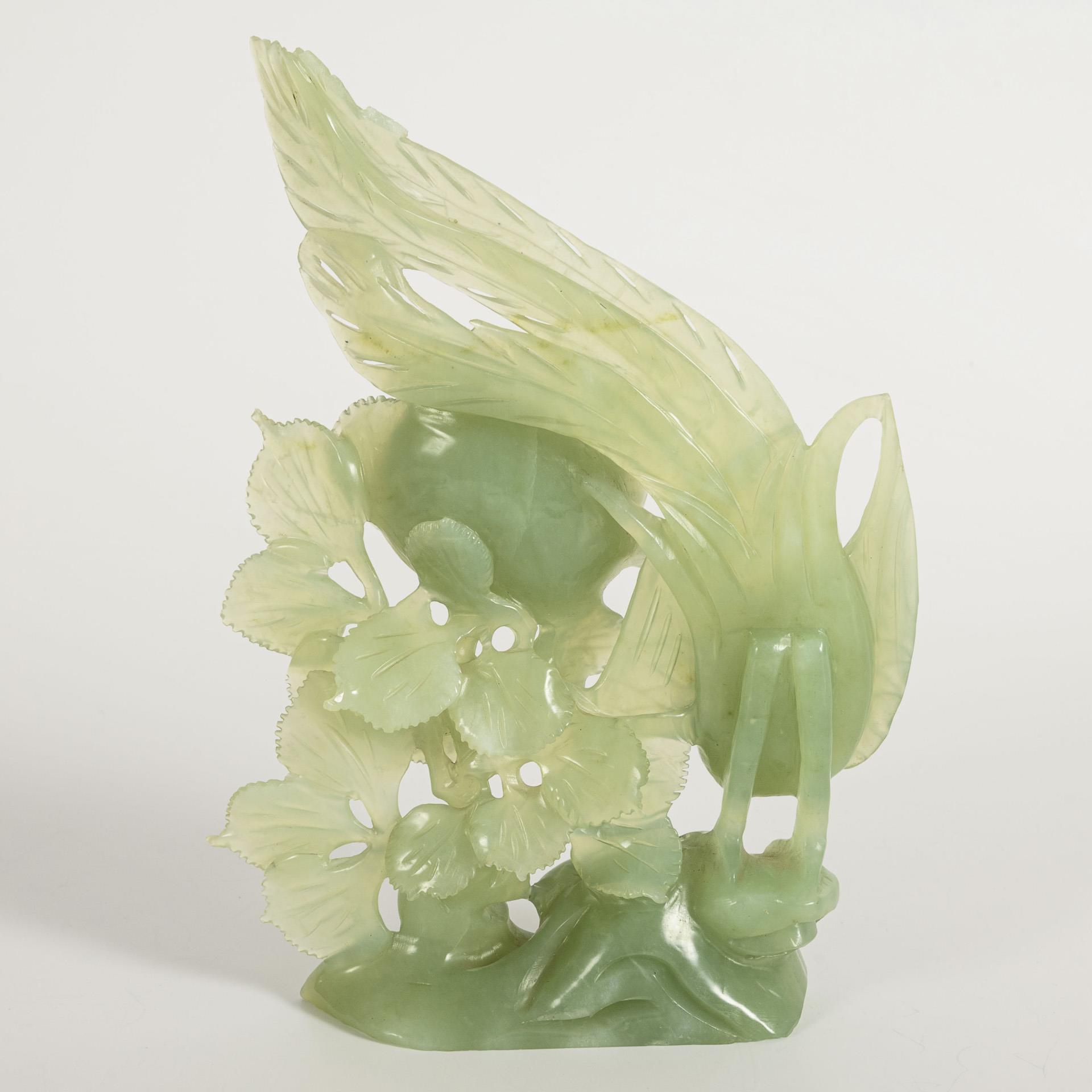 Phönix mit großer Blüte aus hellgrüner Jade, mit Holzsockel. Bestoßung an der Schwanzspitze.