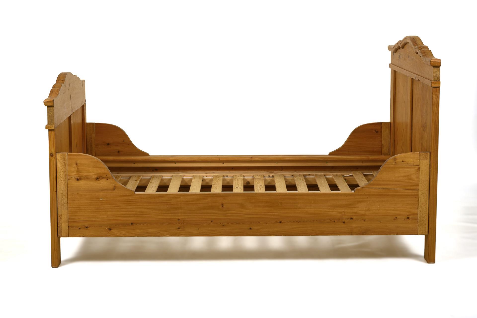 5-teilig. Kassettiertes Kopf- und Fußteil mit geschweiftem Abschluss, Seitenwangen mit Bogensegmenten, ergänzter Lattenrost (Lattenlänge ca. 100 cm). Steckverbindung, zerlegbar. Fachgemäß auf 2 Meter Länge erweitert.