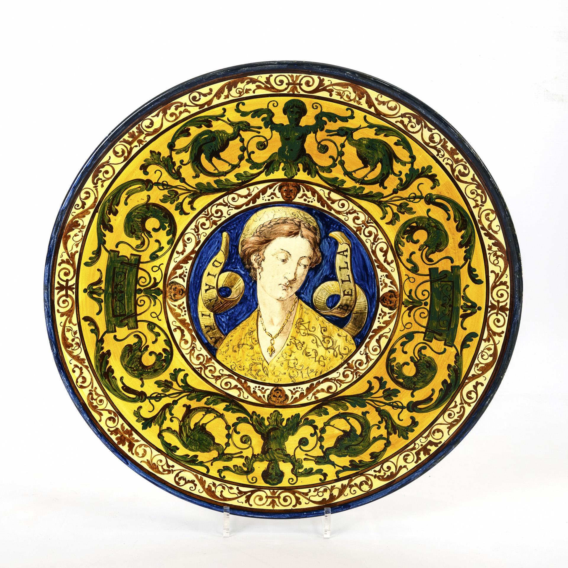 Im Stil italienischer Renaissance-Majolika gestaltete Rundplatte mit zentralem Figurenmedaillon, auf einem Schriftband bezeichnet "Dianira Bella", gerahmt von einer dreiteiligen Fahne mit Blattranken und Groteskenfiguren. Mit Drahtaufhängung.