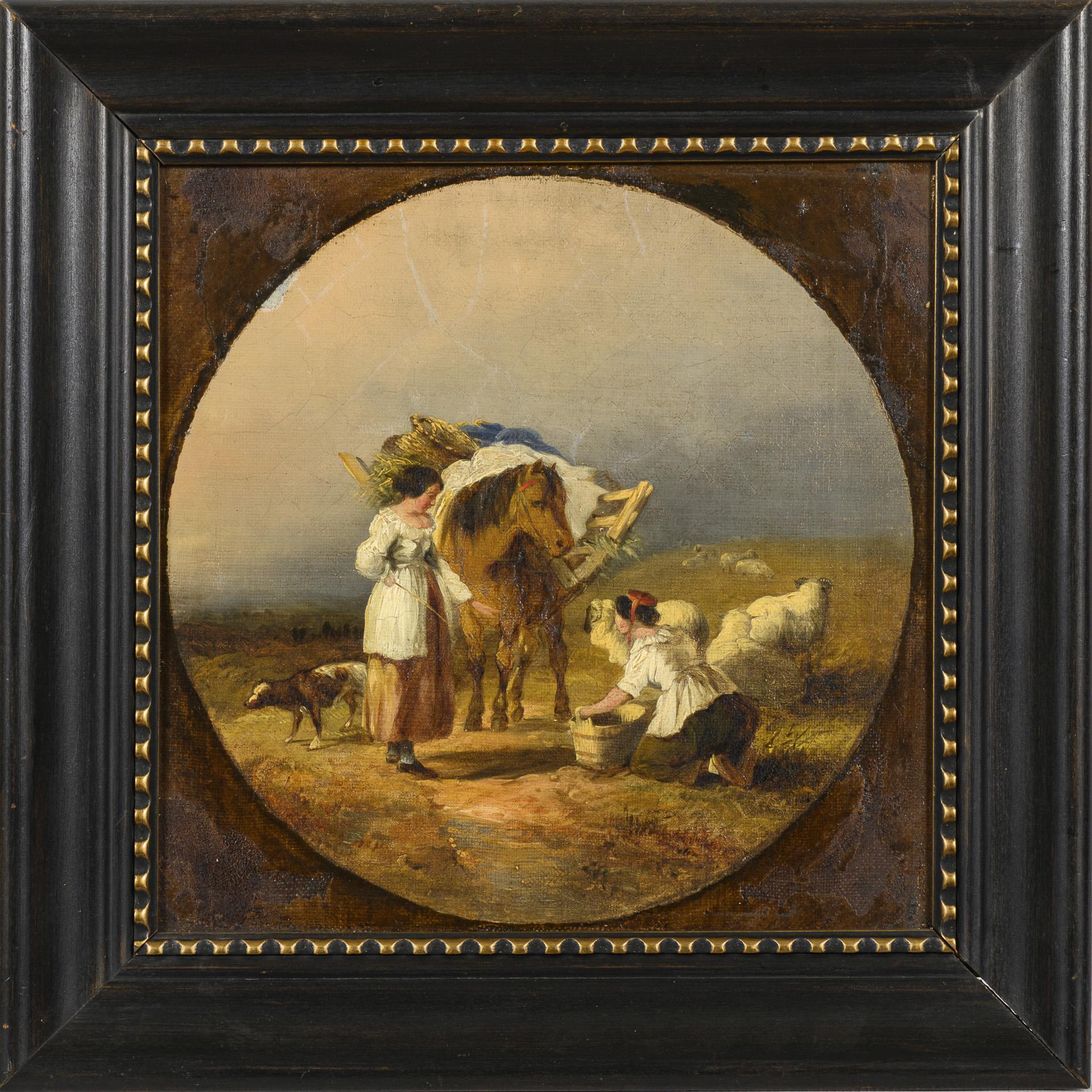 Zwei Frauen mit Schafherde, Hund und beladenem Pferd auf einem Wiesenhügel vor wolkigem Himmel. Altersspuren.