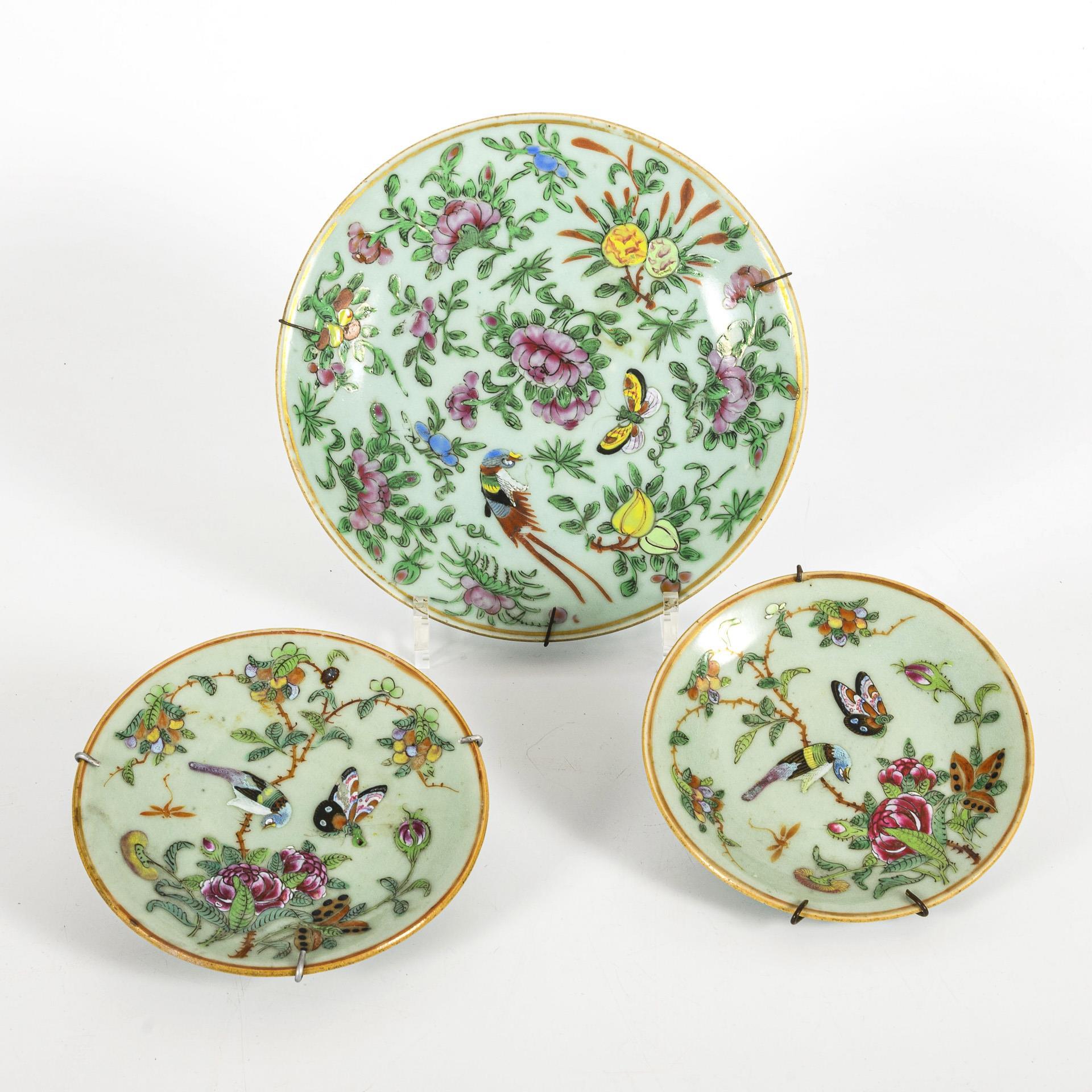 2 kleine Teller und ein größerer, mit Seladonglasur und polychromer Emailmalerei. Darstellung von Blüten, Vögeln und Schmetterlingen. Goldränder berieben.