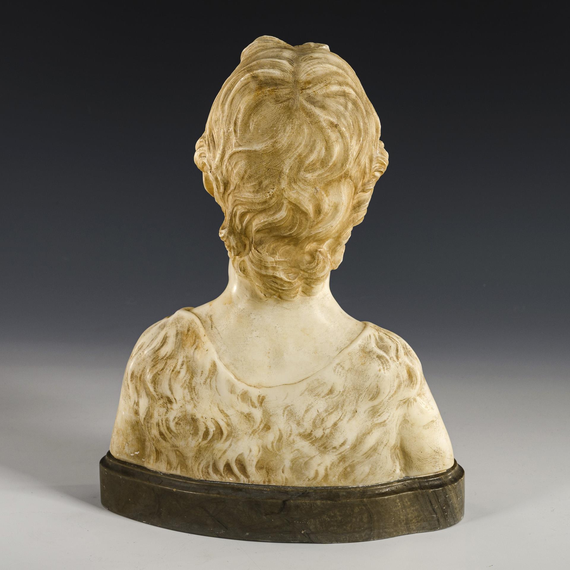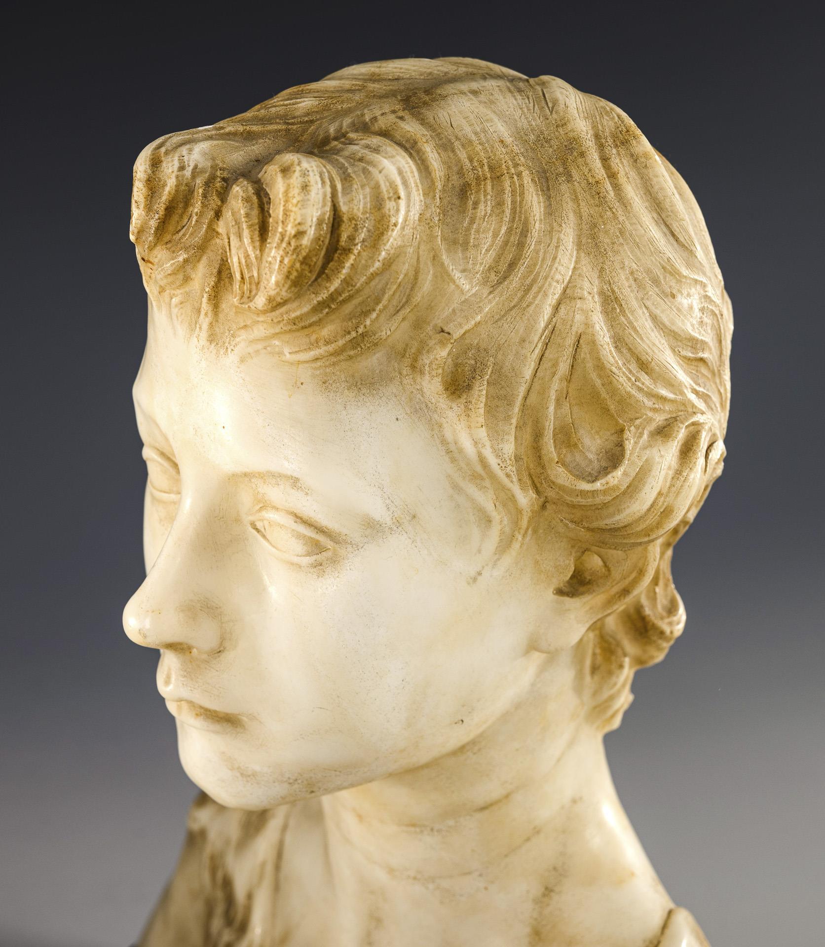 Alabaster, teils leicht eingefärbt, graue Marmor-Plinthe. Anfang 20. Jh. H 30 cm, gesamt 33 x 27 x 15 cm. 9 kg.