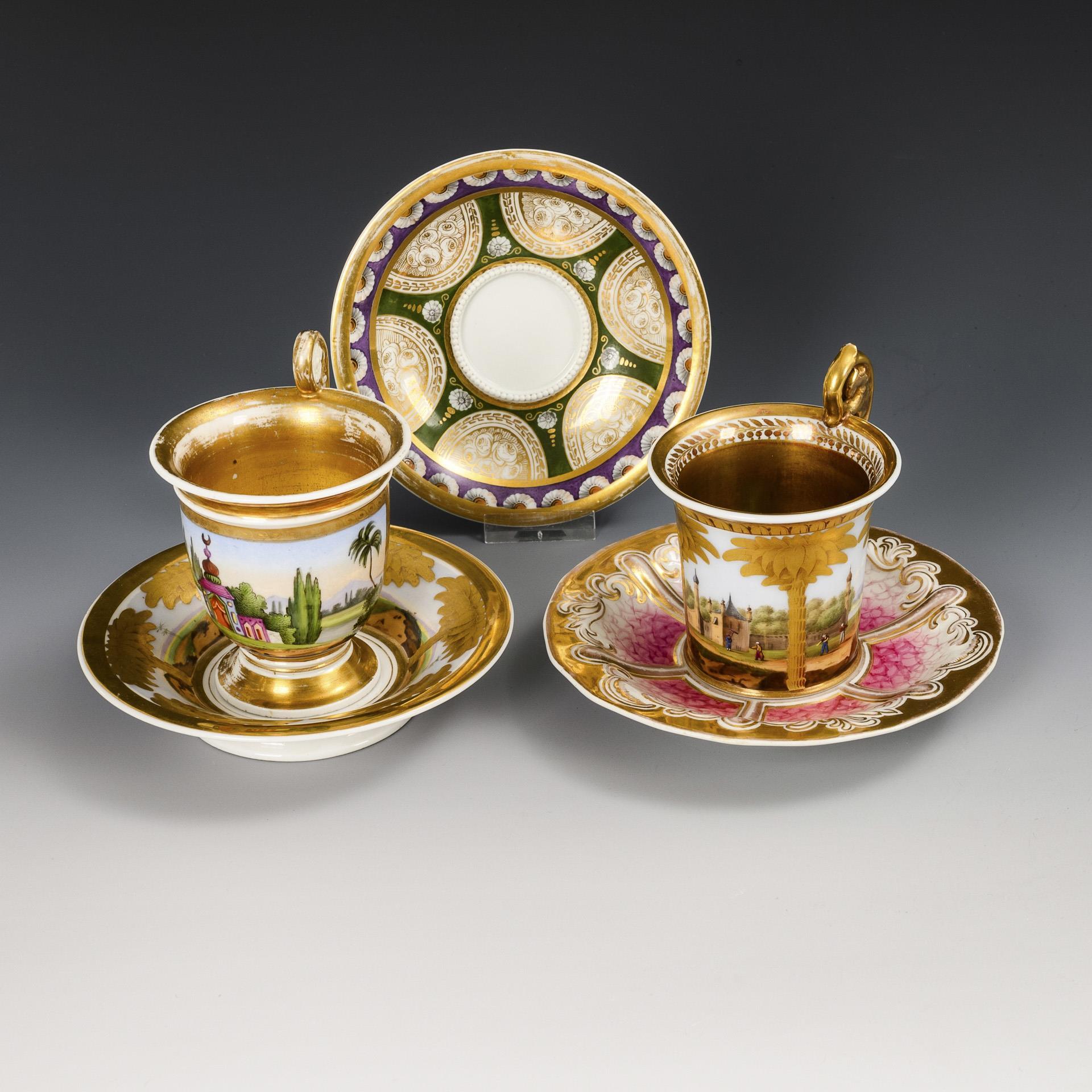 1x prunkvolle Kratertasse (H 10 cm) mit Greifenkopfhenkel und originaler Untertasse (Ø 14,5 cm): zwischen goldradierten Palmen die Darstellung einer orientalischen Landschaft mit Architektur und Personenstaffage. / 1x gefußte Kratertasse (H 11 cm): schauseitig eine goldgerahmte Rechteckkartusche mit der Darstellung einer orientalischen Landschaft mit Moschee. / Dazu 2 verschiedene Untertassen: 1x mit farbig-goldener Floral- und Ornamentmalerei (Ø 14 cm) und 1x mit purpurfarbener Staffage und Goldstaffage (diese Schumann, Berlin; Ø 15,5 cm). Partieller Goldabrieb, Haarriss in 1 Untertasse und an 1 oberen Henkelansatz.