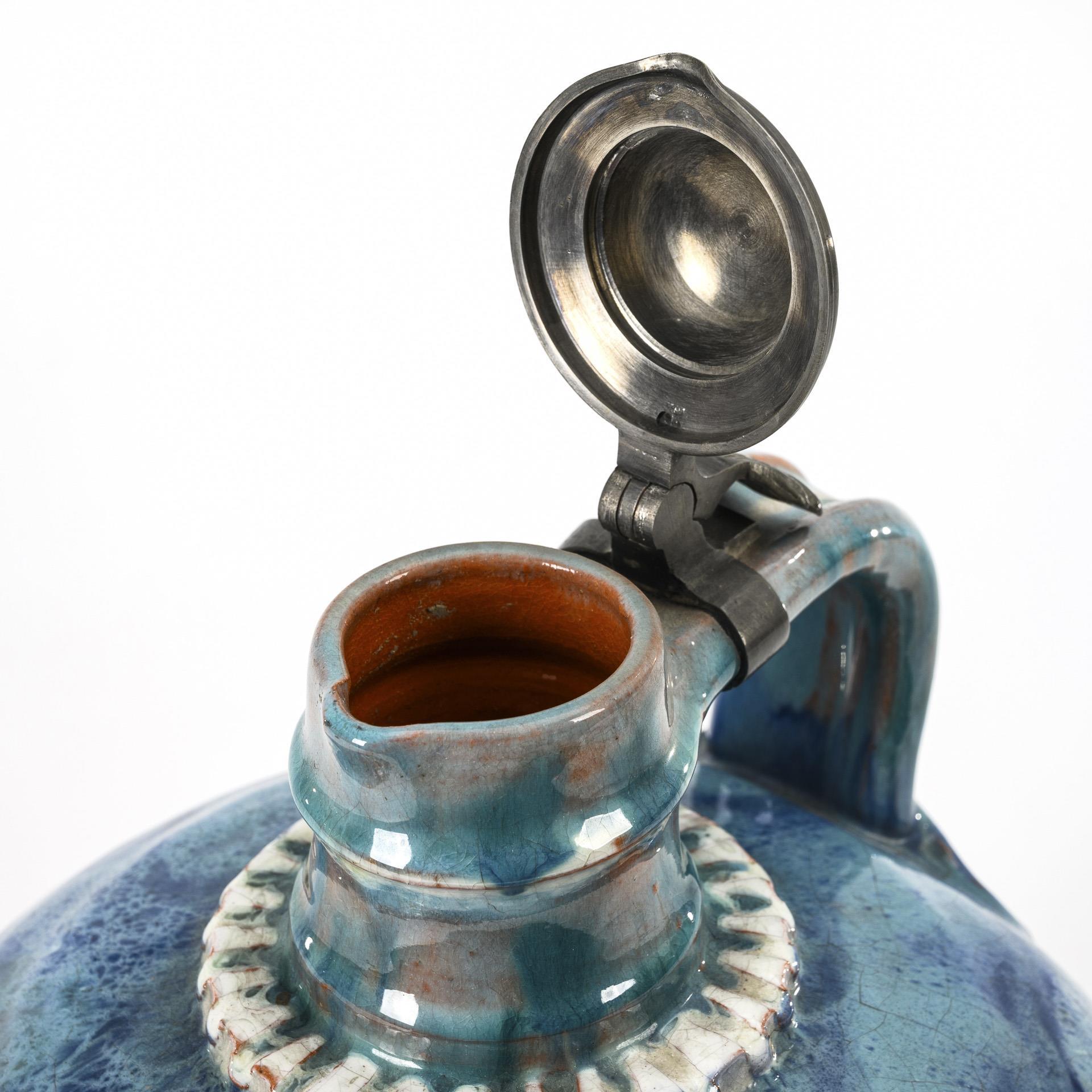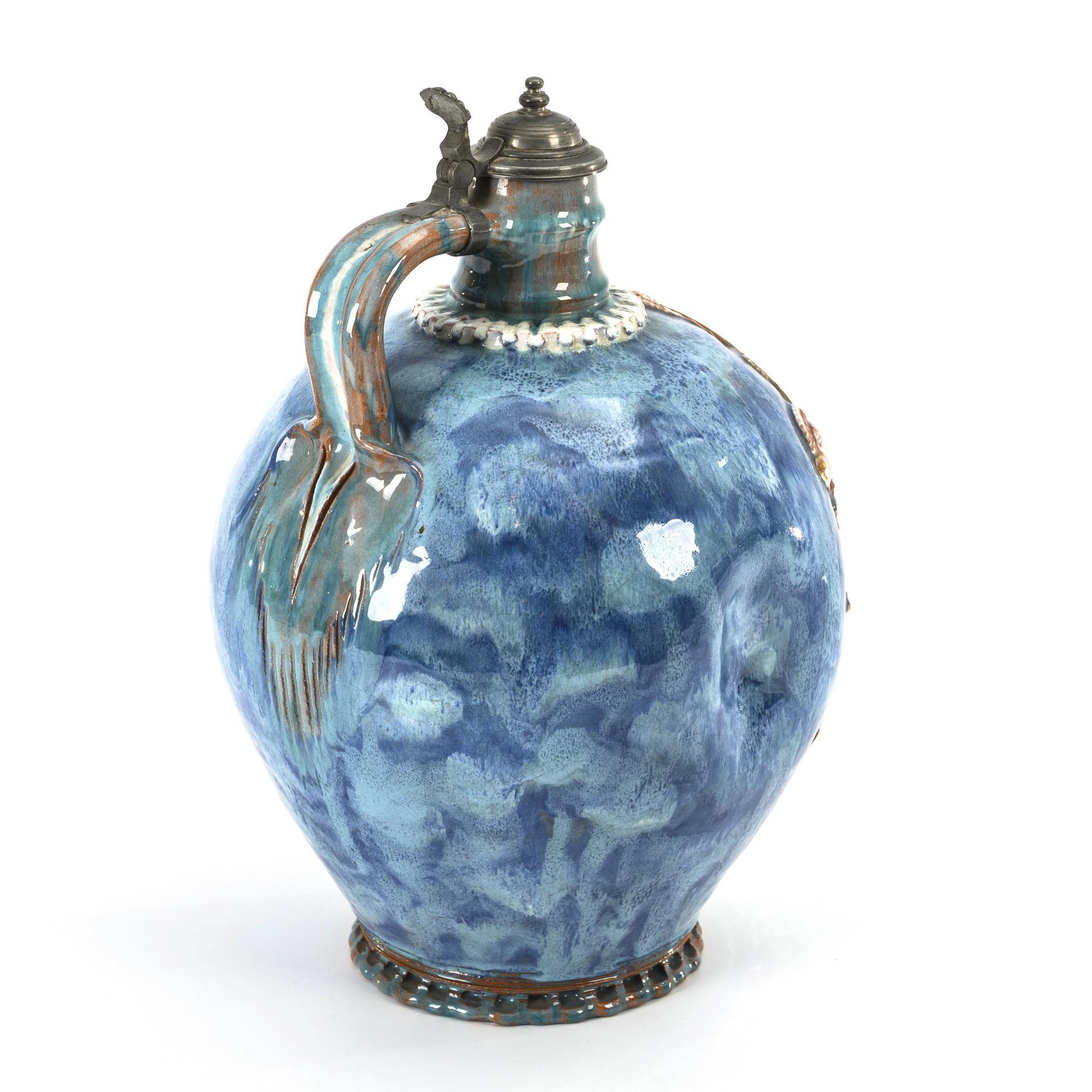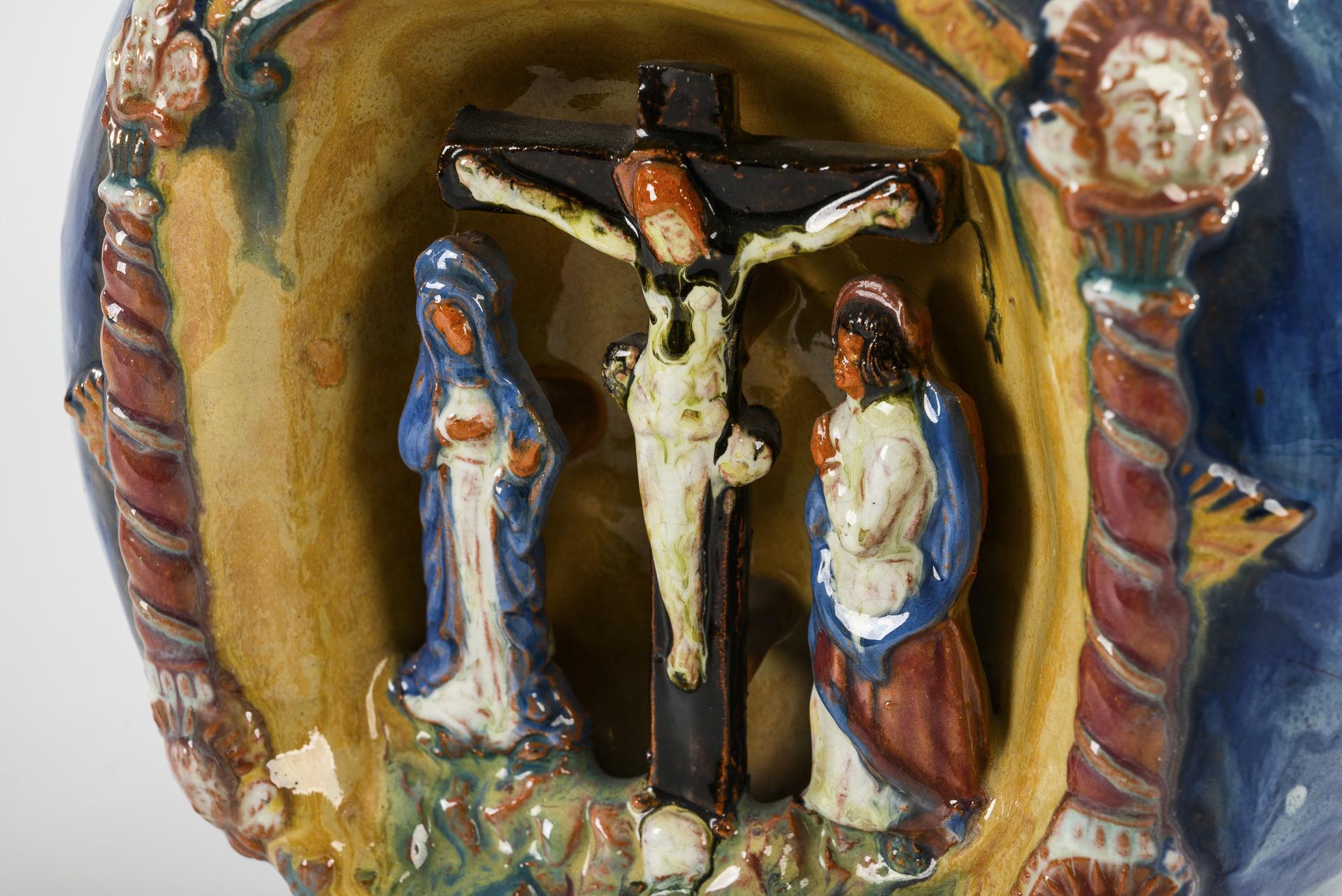 Historistische Fayence-Kanne mit Kreuzigungsgruppe. Münchener Werkstätten für Keramische Kunst.