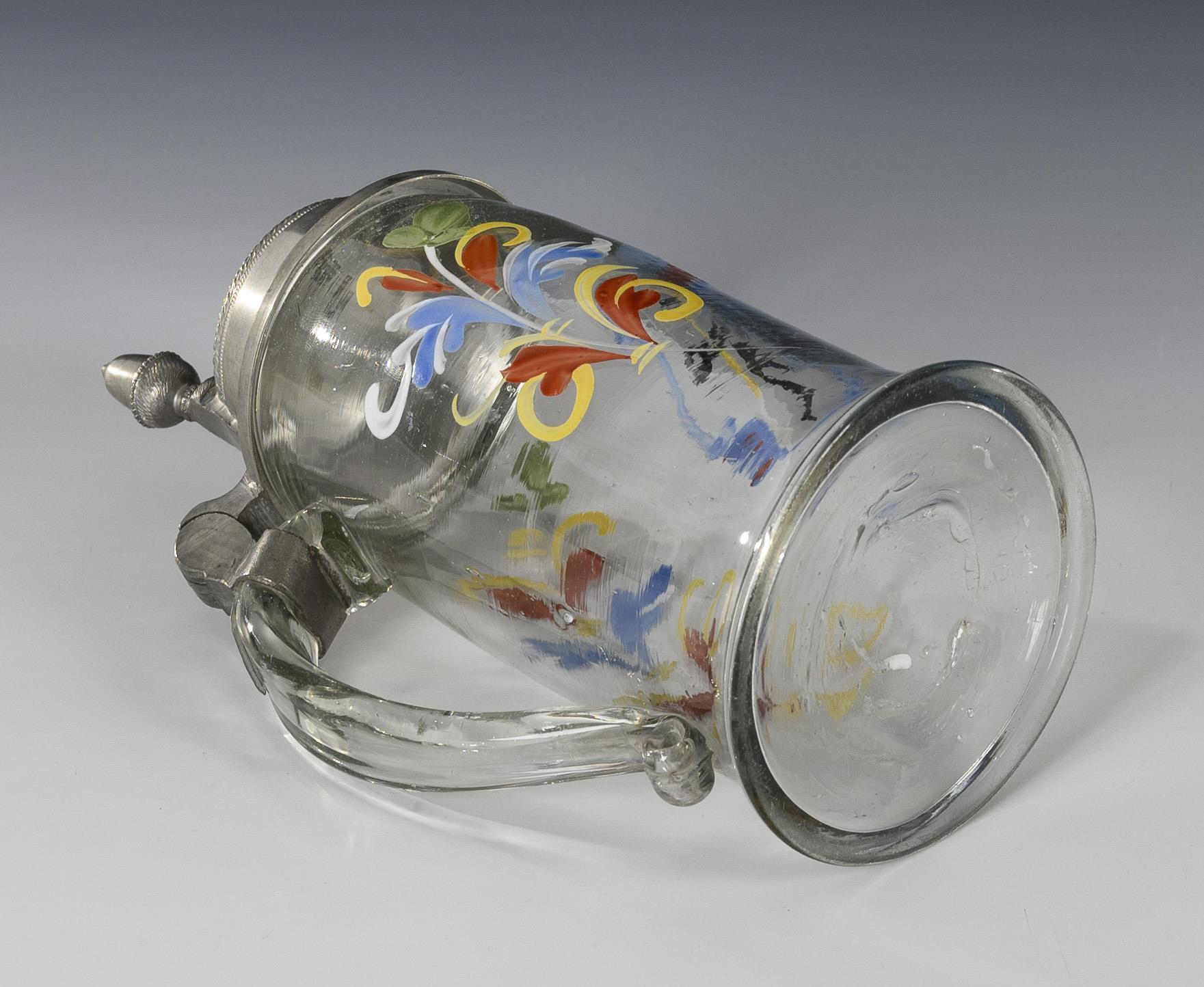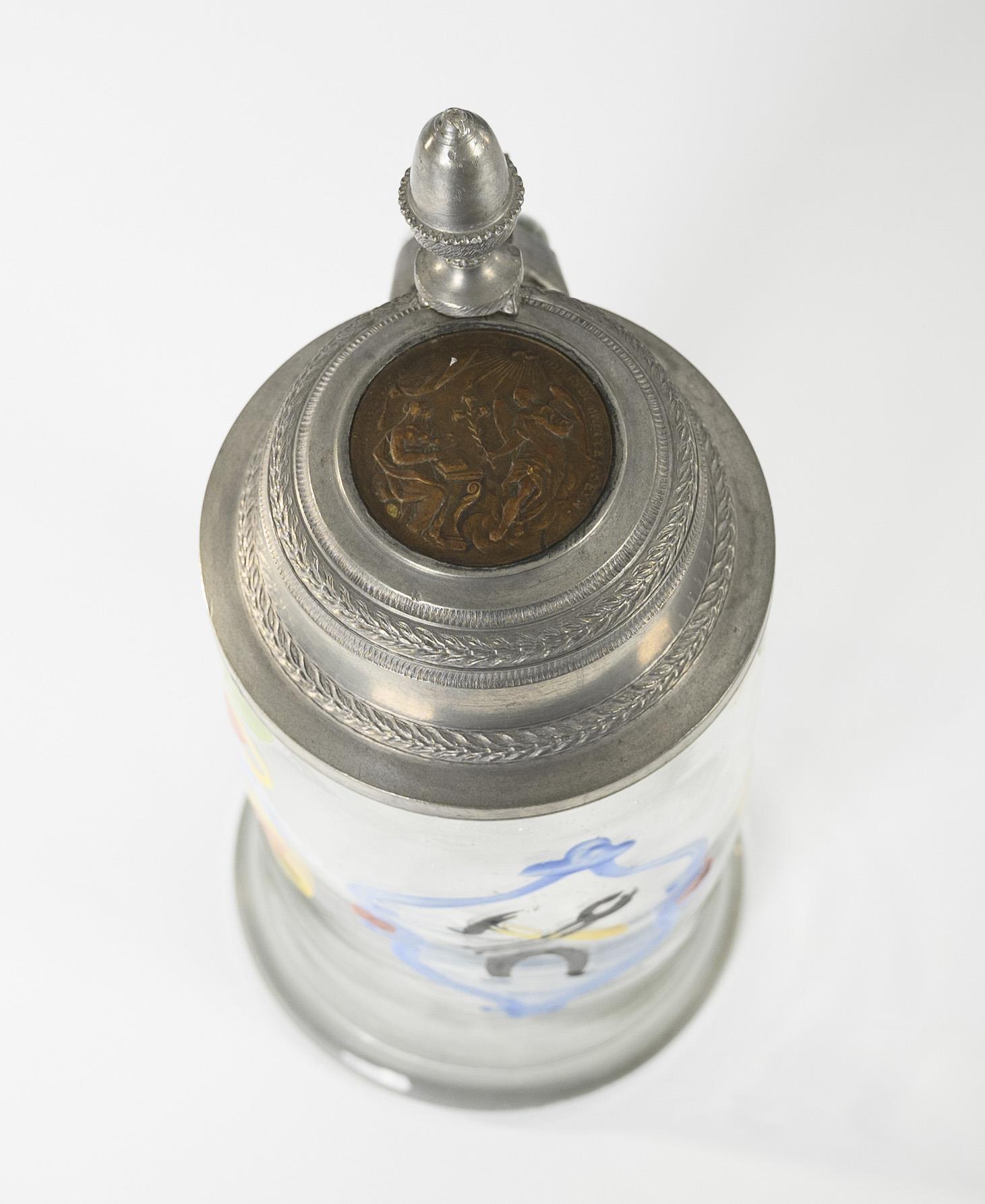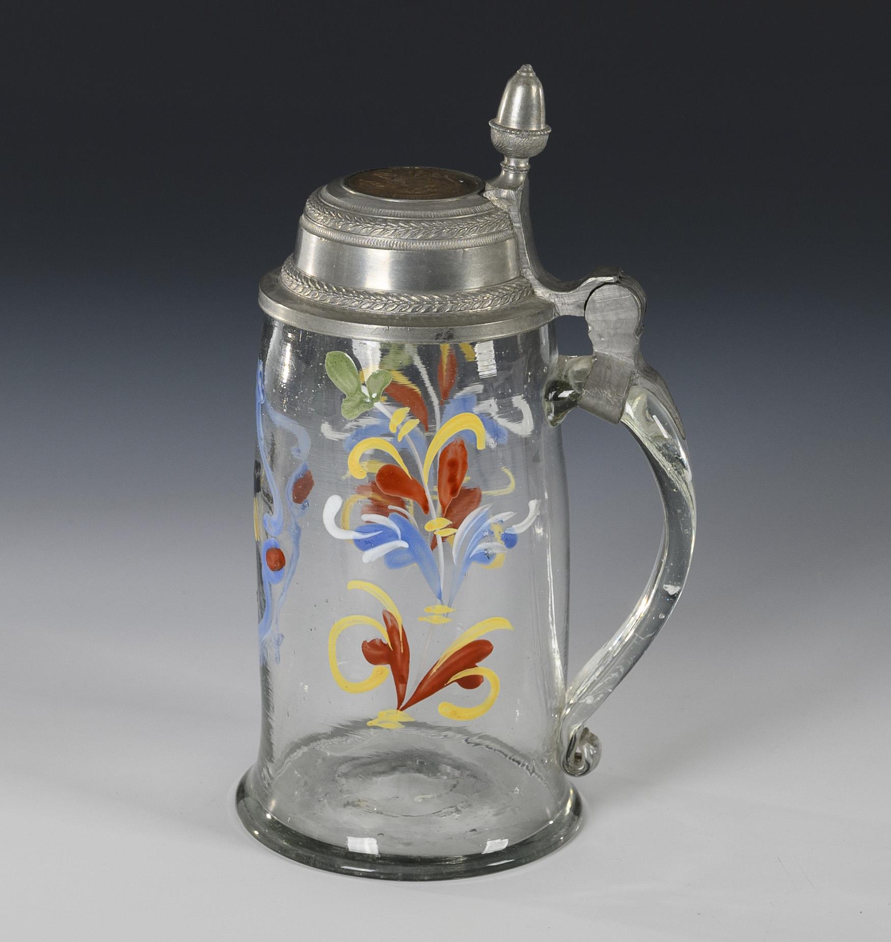 Walzenkrug mit Bandhenkel und zinnmontiertem Scharnierdeckel; Abriss. Mit dem schauseitigen, von vegetabilen Zweigen flankierten Zunftzeichen der Hufschmiede.