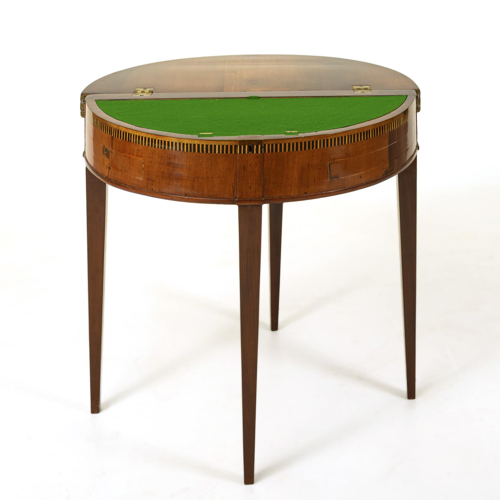 Halbrunder Konsoltisch mit 3-fach aufklappbaren Deckplatten und hohem Zargenfach mit schwarz-weißem Zierfries, auf 4 konischen Beinen. Schwenkbares Stützbein mit 2 verstellbaren Plattenstützen als Ablagehilfe für die höhendifferenten Klapplatten. Runde Spielflächen mit 1x Schachbrett-Marketerie und 1x grünem Filzbezug, 1x grüner Filzbezug auf dem halbrunden Scharnierdeckel über dem Zargenfach. Messingscharniere. Ursprünglich abschließbar, hier ohne Schloss und Schlüssel. Restauriert, mit Ergänzungen und wohl leichten Veränderungen, partiell Furnierdefekte.
