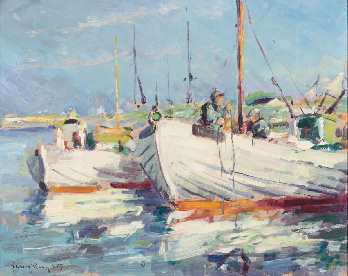 Fischer in den Booten am Ufer im hellen Sonnenlicht.