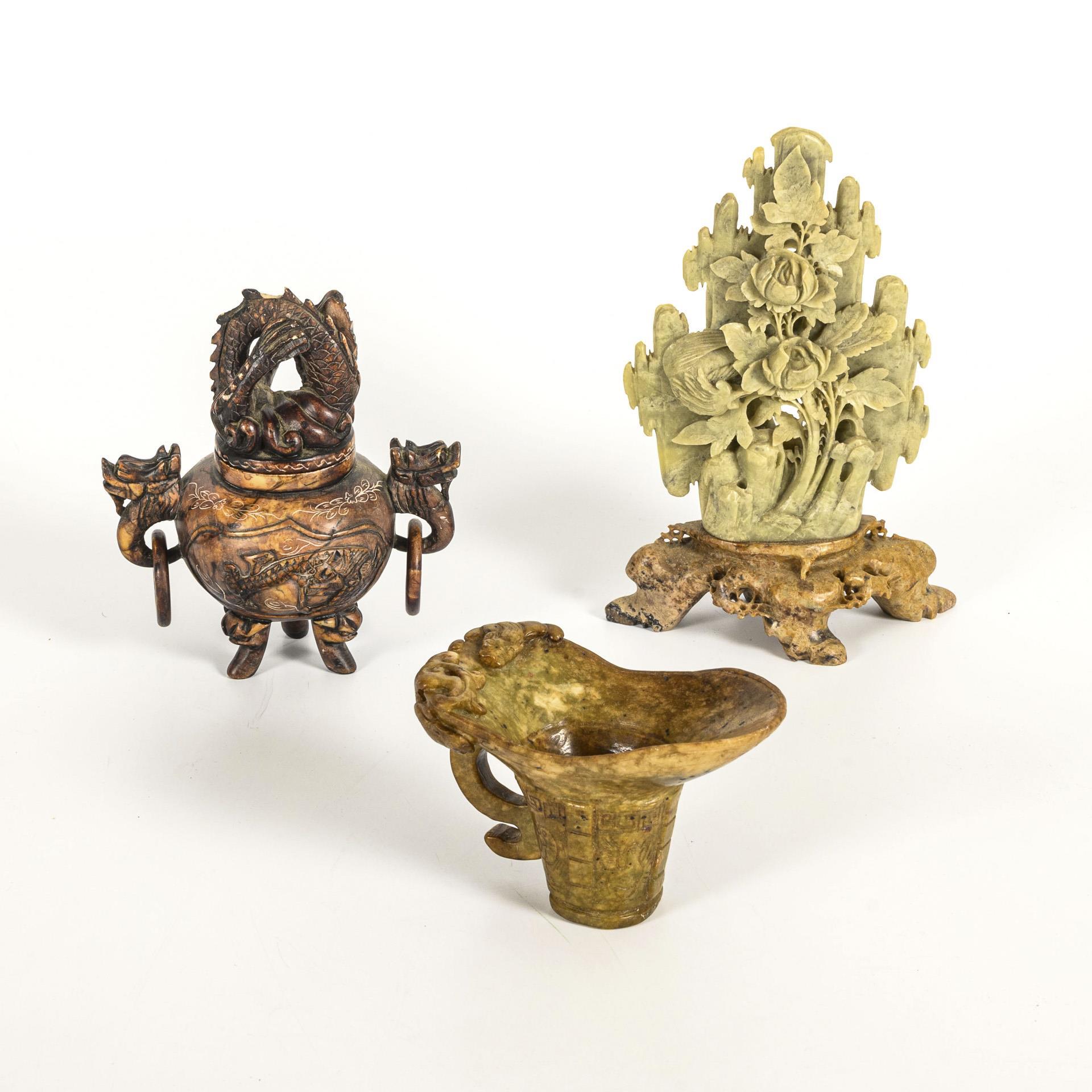 Gefäß aus brauner Jade, mit reliefierter Wandung und plastischen Tieren am oberen Rand. H 7 cm. / Specksteinrelief mit Blüten, ein Fuß alt bestoßen. H 17,5 cm. / Deckelgefäß in der Art der Räuchergefäße, mit beweglichen Henkeln. Chip am Deckel. H 13 cm.