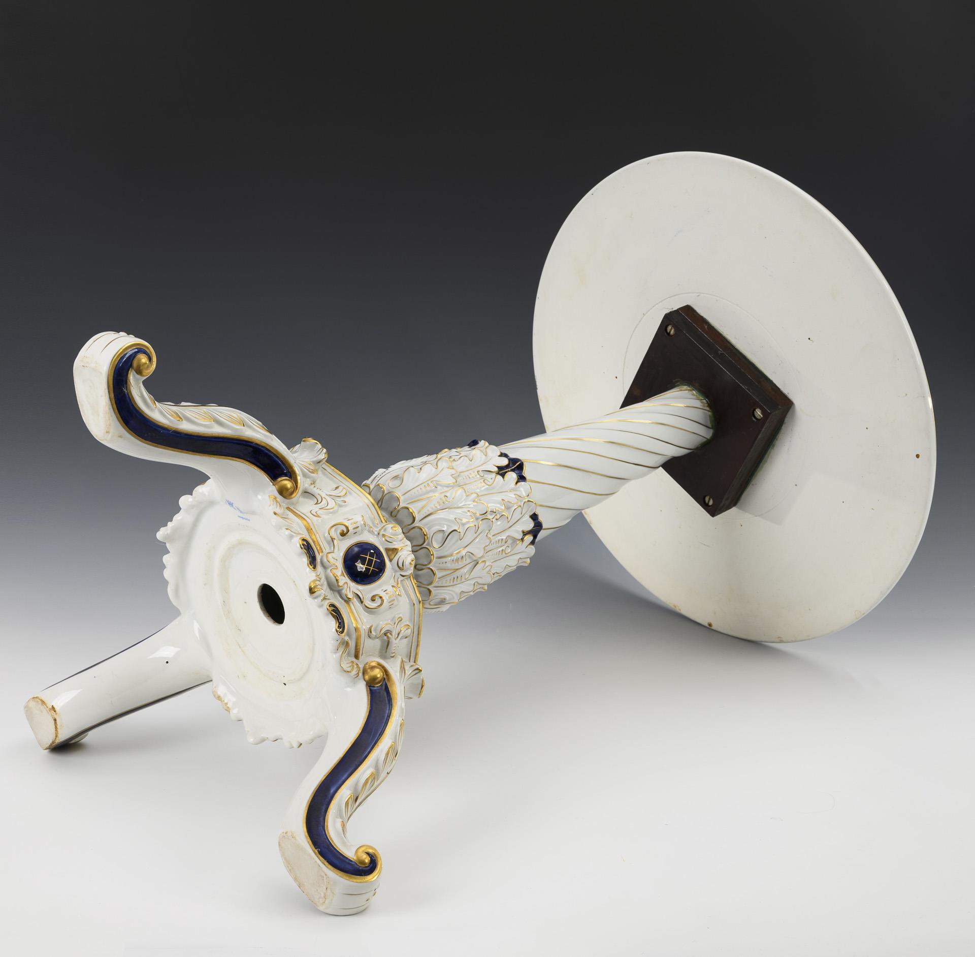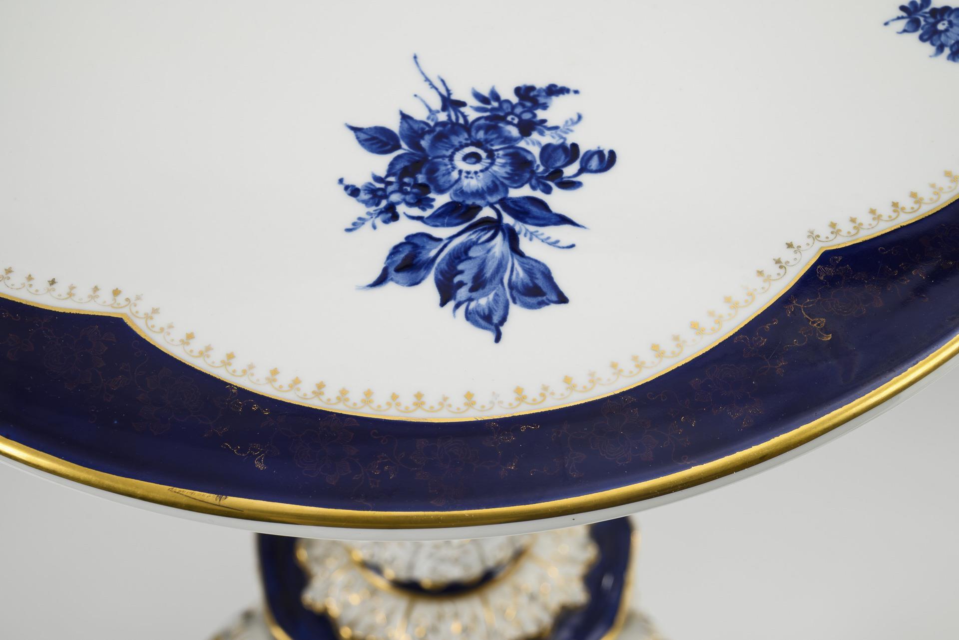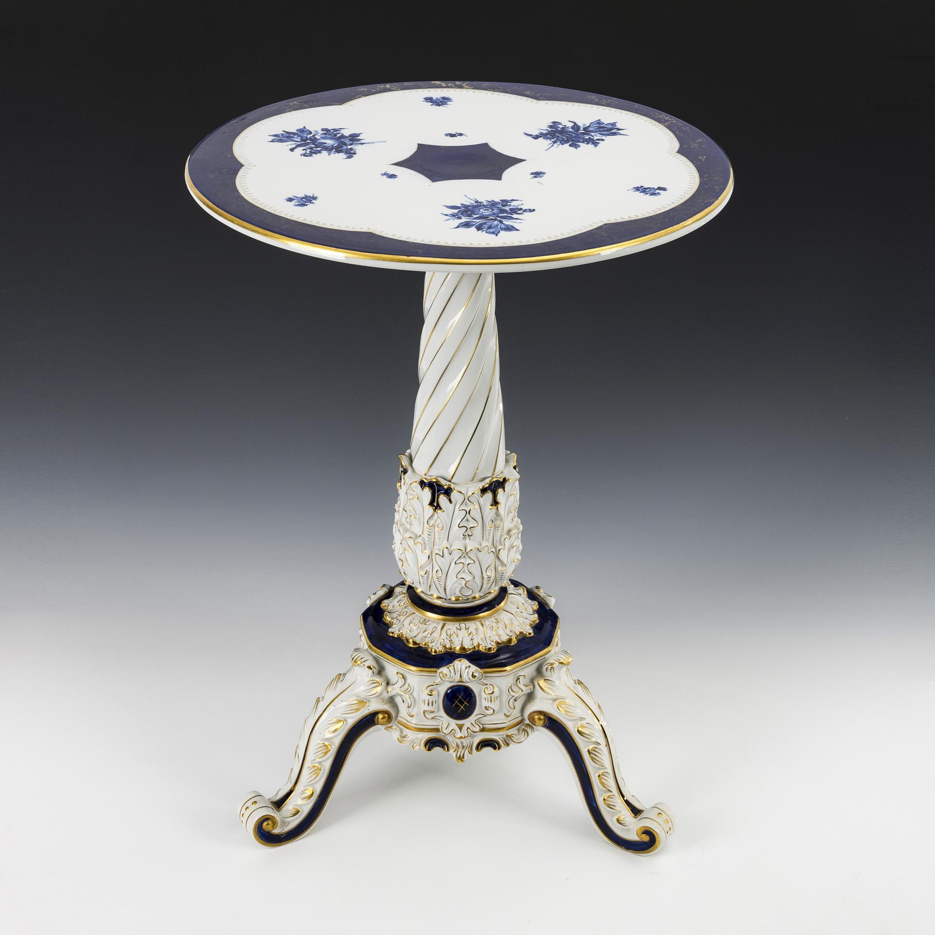 Unterglasurblauer Teilfond, unterglasurblaue Blumenbuketts, Goldstaffage. H 65 cm, Ø Tischplatte 46 cm. 9,8 kg.
