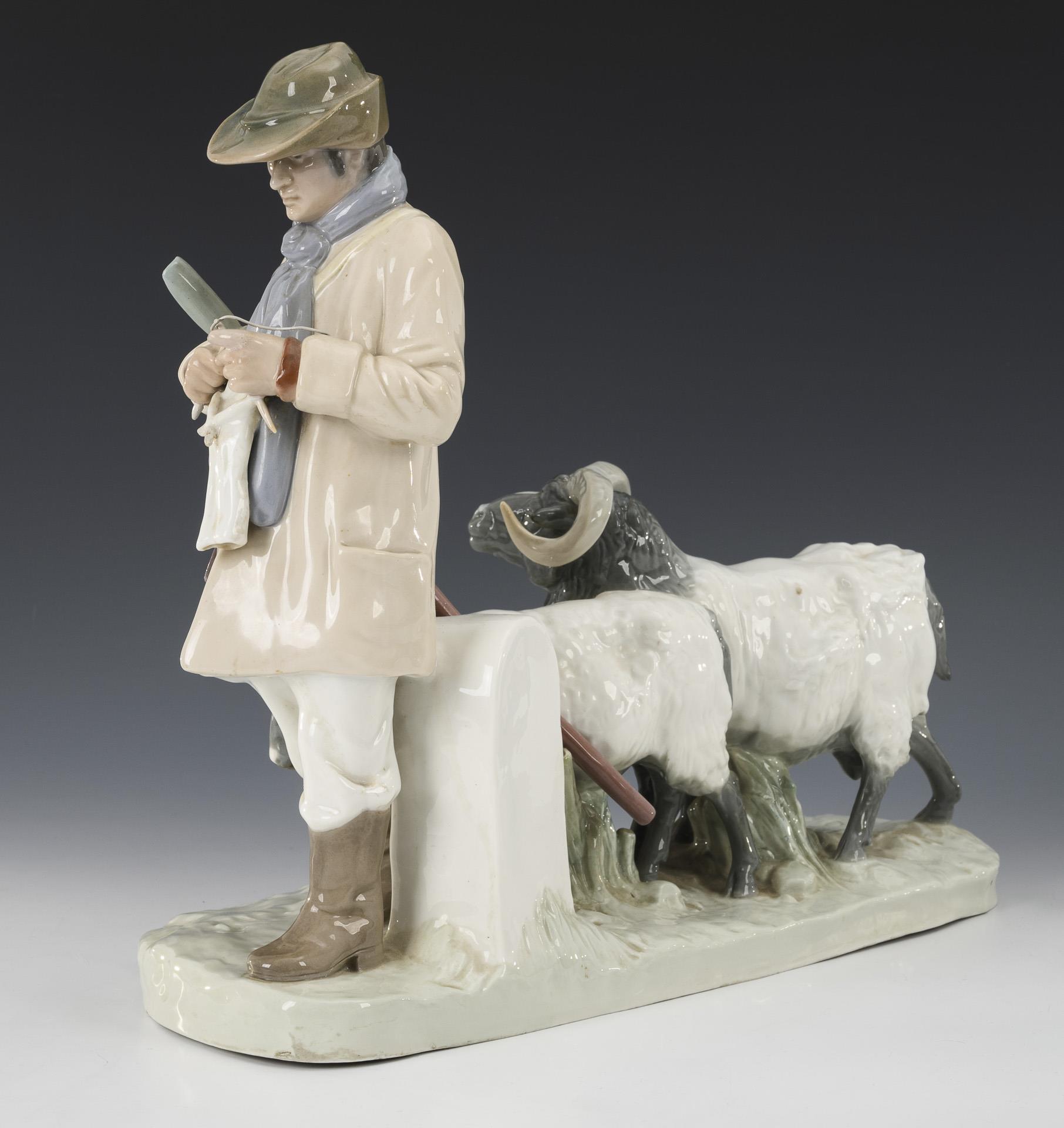 An einem Grenzstein stehender, einen Strumpf strickender Schäfer mit drei Schafen. 1 Finger und Stricknadeln restauriert.
