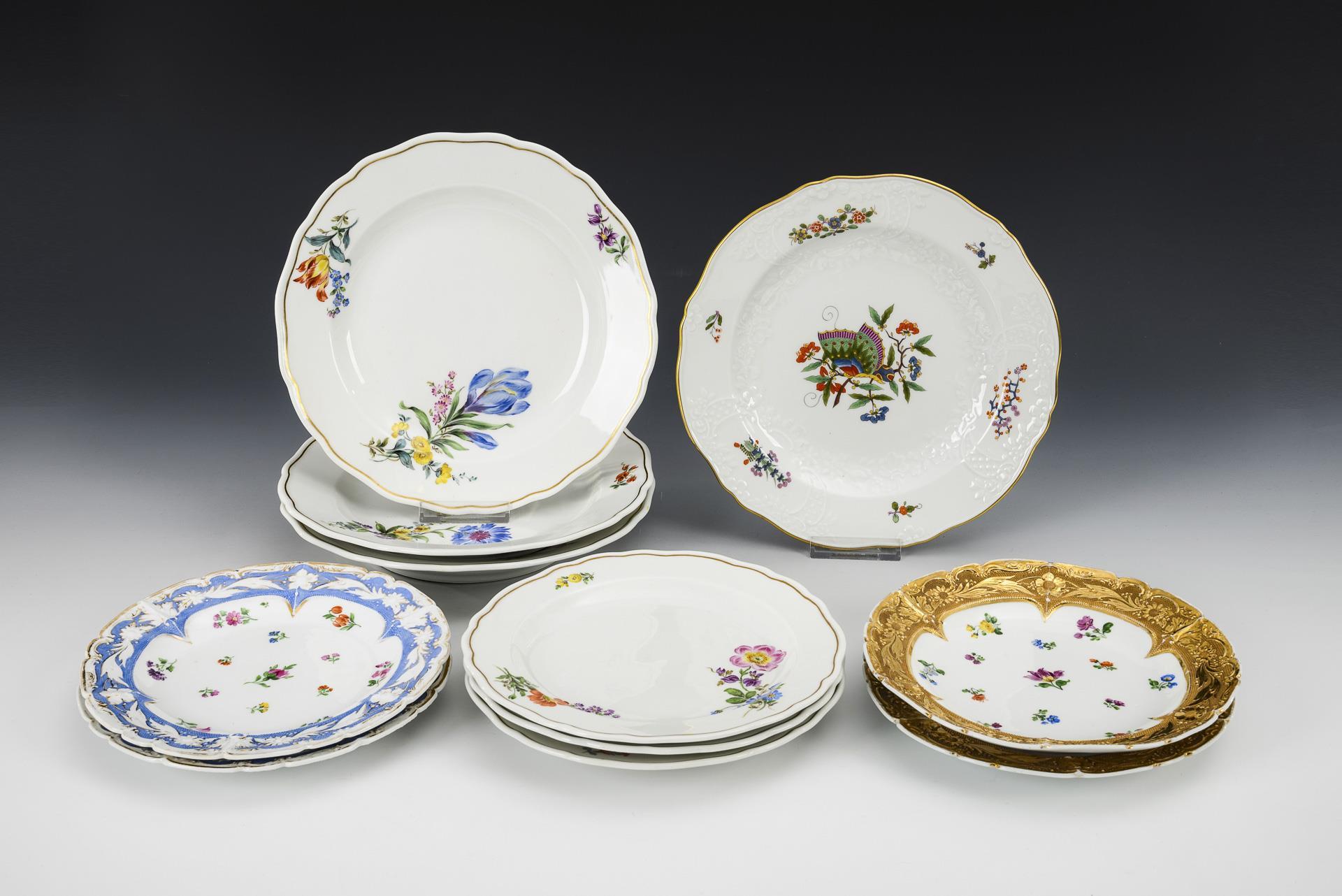 10x mit Blumenmalerei: 3 Speiseteller (Ø 25,5 cm) und 3 Frühstücksteller (Ø 22 cm) "Neuer Ausschnitt", 2 Reliefteller mit goldstaffierter Fahne und 2 Reliefteller mit blau staffierter Fahne (Ø je 20 cm). / 1 Speiseteller "Marseille" (Ø 25 cm). Partieller Goldabrieb.