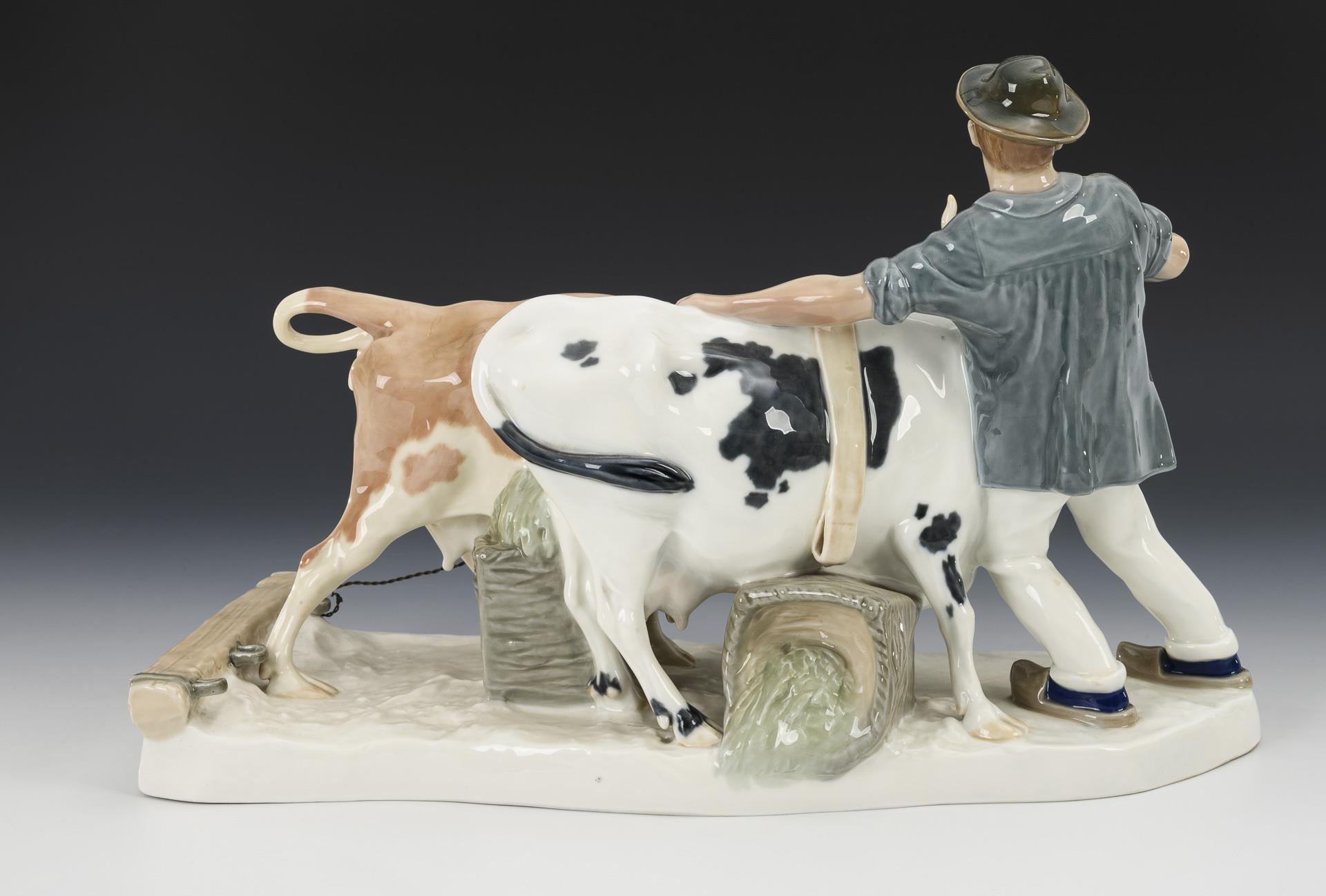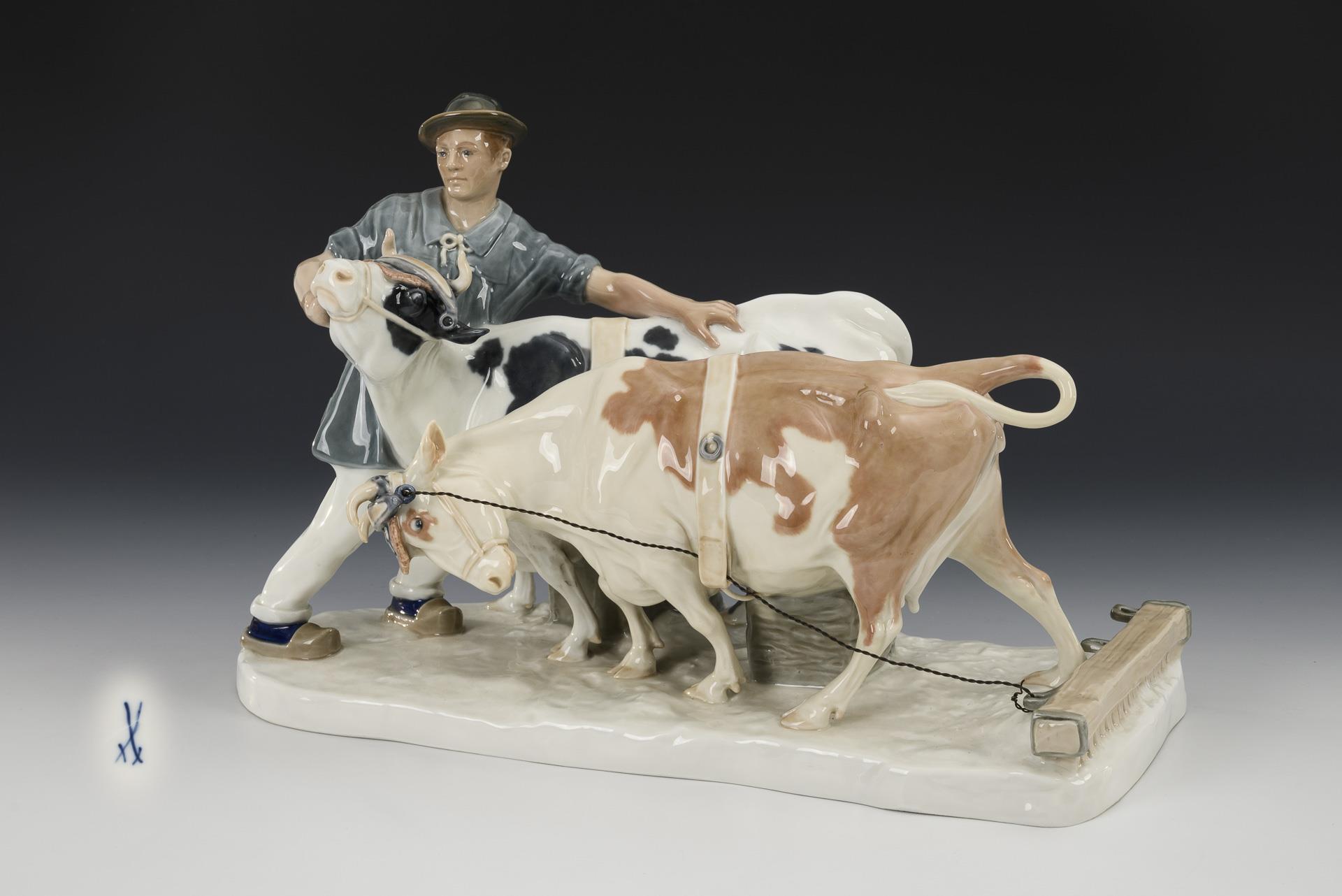 Plastik eines Bauern bei der Feldarbeit mit zwei Kühen am Ortscheid. Hals des Bauern und 2 Hörner mit Stirnjoch restauriert, 1x Öse des Stirnjochs restauriert, Haarriss am Bauch einer Kuh.